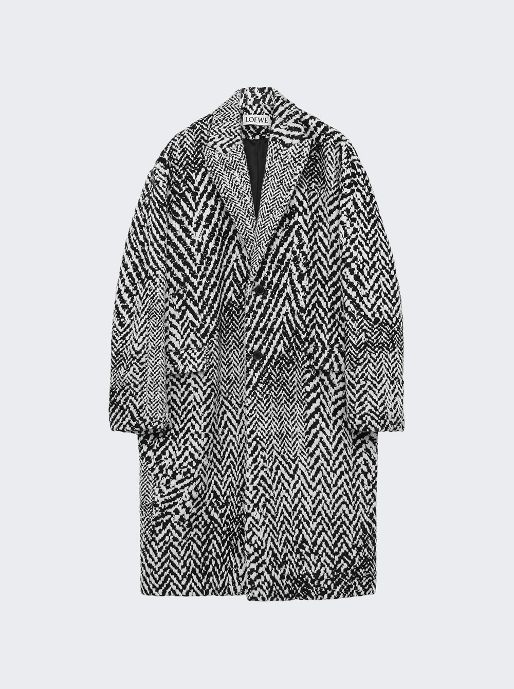Details - Long length - Placed chevron pattern - Single breasted - Peak lapels - Stitched cuffs - Button front fastening - Flap pockets - Fully lined Dimensions: Model is 6'1"/185cm and is wearing a size 48 Composition: Wool Blend Care: Care according to label Brand Style: HSM1Y01W09 Designer/Brand: LOEWE