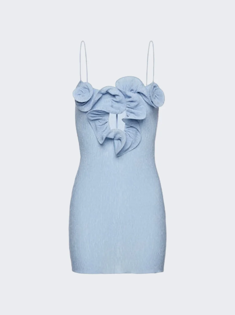 Mini Crepe Beach Dress With Floral Neckline Light Blue