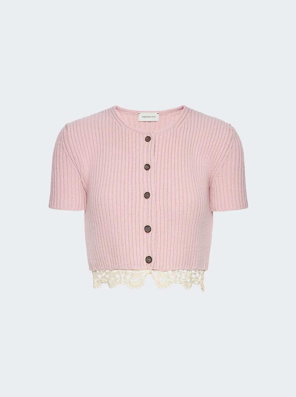 Details - Cropped silhouette - Round neckline - Button closure - Delicate crochet lace trim along the hem - Care according to label - Material: 100% Cashmere Vendor Color Code: Brand Style: 320426 Designer/Brand: MAGDA BUTRYM