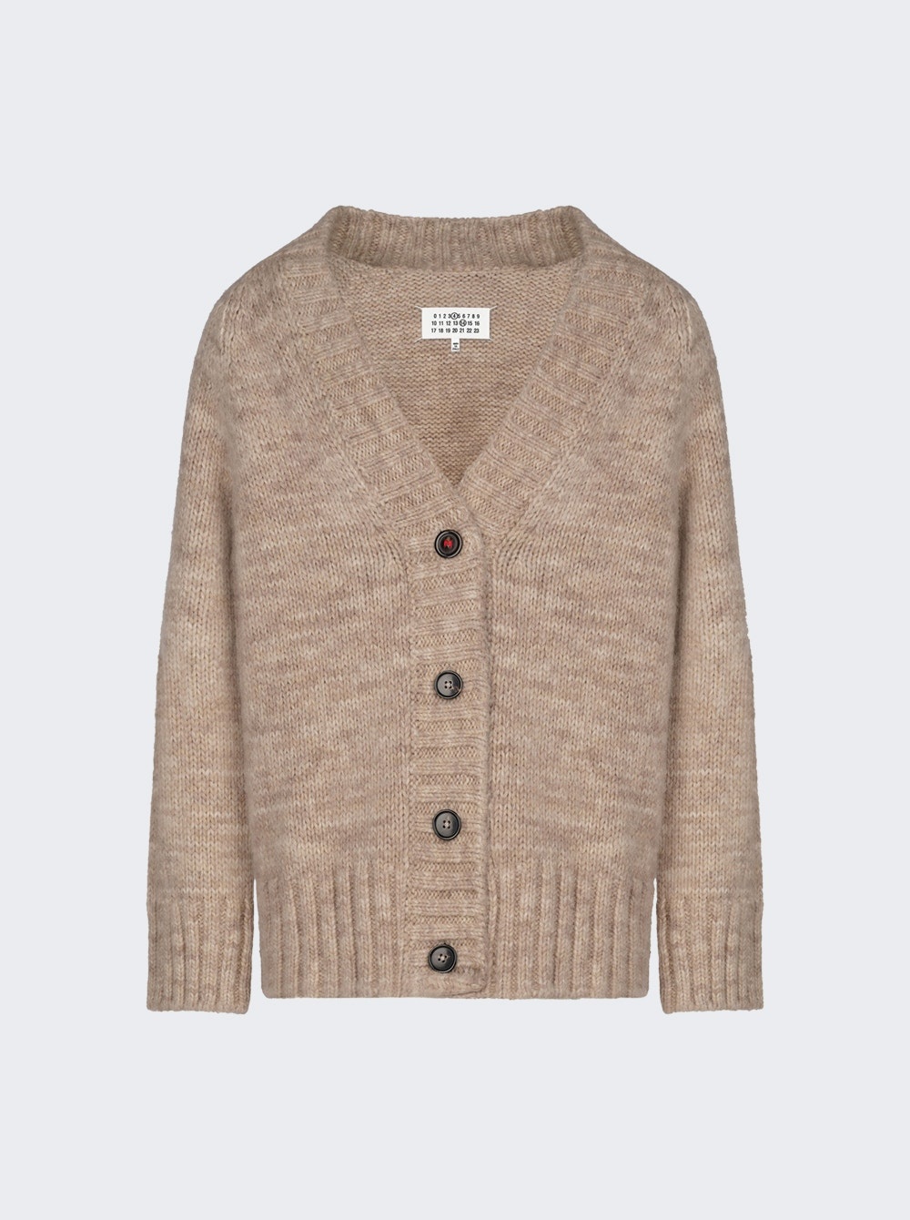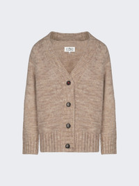 Details - V-neck knit cardigan with botanical dye - Gauge 3 - Ribbed trims - Horn button closure with red M embroidery - Maison Margiela's signature, the Four stitches, appear at the back Dimensions: Model is 6'1"/185cm and is wearing a size M Composition: 42% Alpaca, 30% Cotton, 28% Wool Care: Care according to label Brand Style: SI0GP0004 S17802 Designer/Brand: MAISON MARGIELA