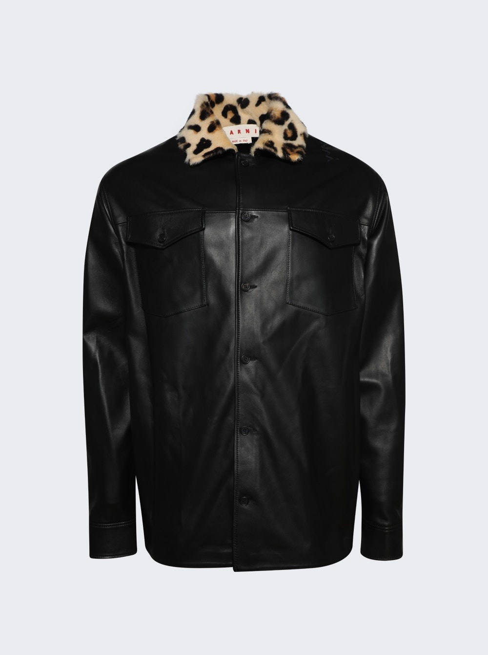Details - Long-sleeved shirt - Smooth and supple nappa leather - Contrasting shaved shearling collar with animalier print - Relaxed fit - Chest patch pockets with buttoned flaps - Buttoned cuffs and front closure - Handcrafted Marni Mending embroidery on the shoulder - Primary Fabric: 100% Ovine Leather - Secondary Fabric: 100% Lamb Fur - Pocket Lining: 100% Cotton - Model is 6'1"/185cm and is wearing a size EU54 Brand Style: CUMY0025Q1 ULA736 Designer/Brand: MARNI