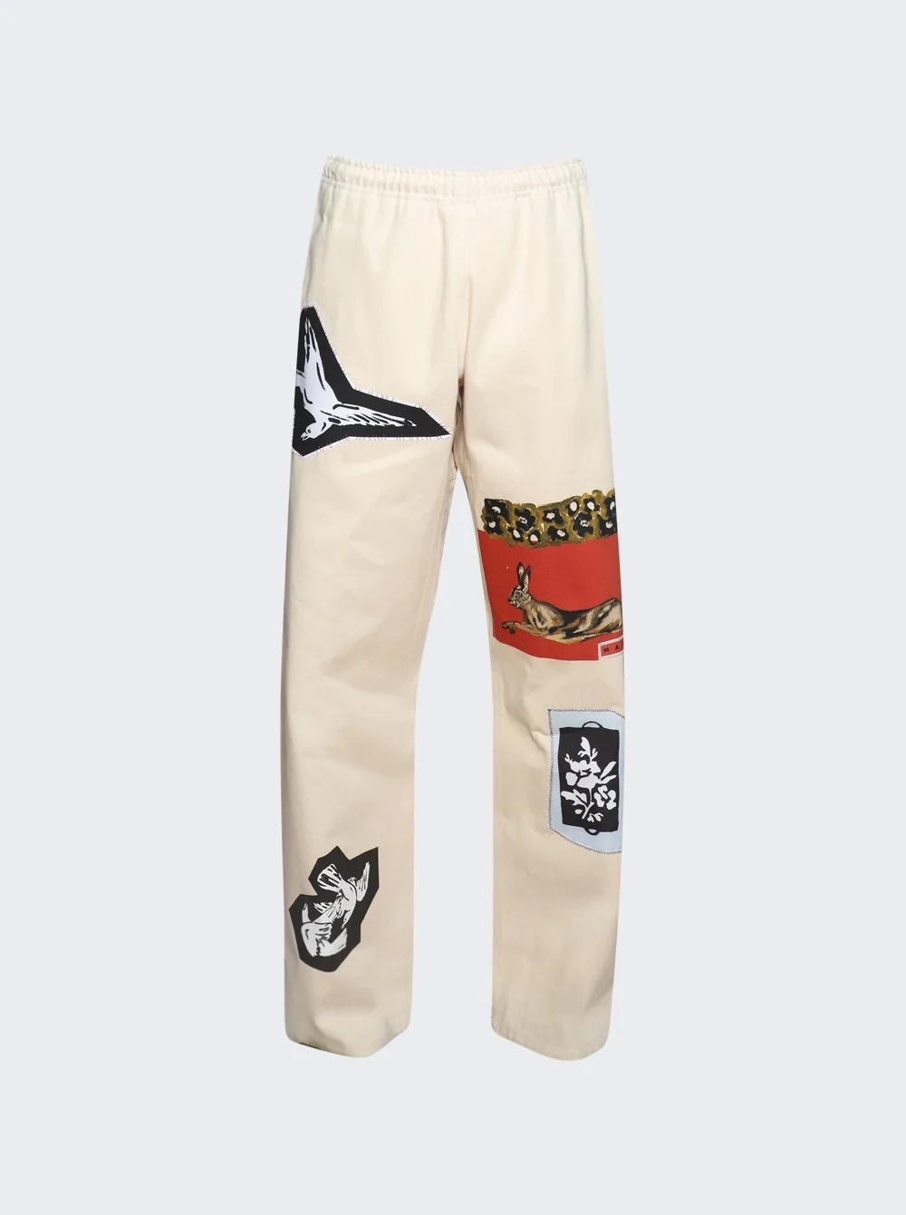 Details - Designed in collaboration with Nigerian-born artists Slawn and Soldier - Regular fit trousers with an inner drawstring - Elasticated waistband - Hand-embroidered Marni Mending logo - Embellished with prints and patches - Material: 100% Cotton Vendor Color Code: Brand Style: PUMU0315SX USCY38 Designer/Brand: MARNI