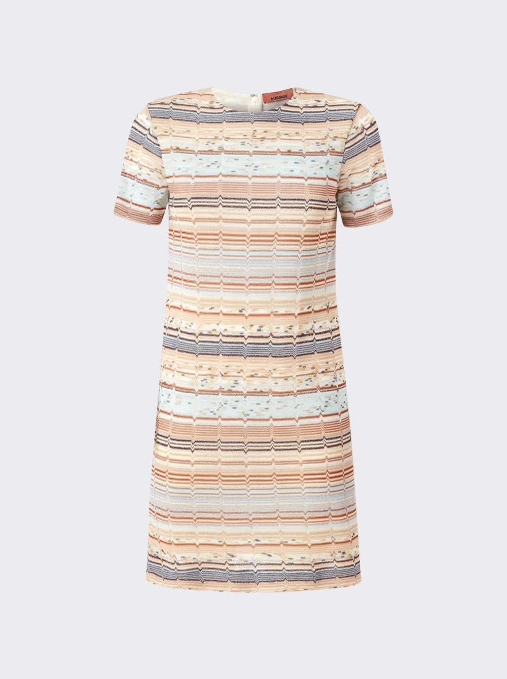 Details - Short sleeve mini - Greek zig-zag - Lame filaments throughout - Model is 5'9"/175cm and is wearing a size IT40 - Main: 65% Rayon, 27% Cotton, 8% Metallic Fiber - Lining: 100% Polyester Brand Style: DS25SG1I BR010Q Designer/Brand: MISSONI