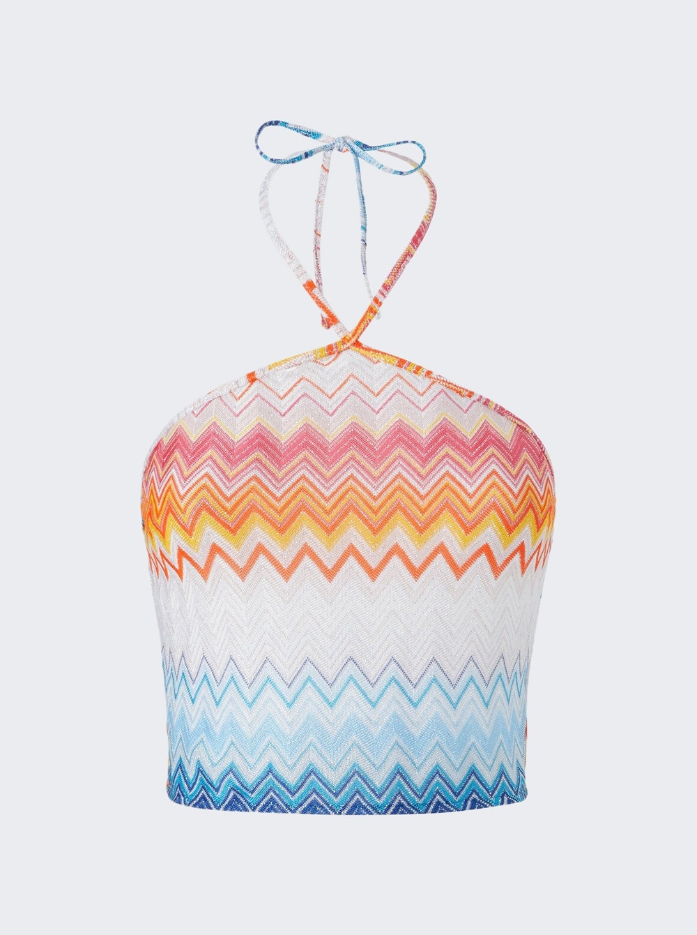 Details - Viscose and lame blend top - Halter neck - Zig-zag pattern - Model is 5'9"/175cm and is wearing a size IT40 - 90% rayon, 6% polyester, 4% polyamide Brand Style: MC23SK01 BR00ZY Designer/Brand: MISSONI