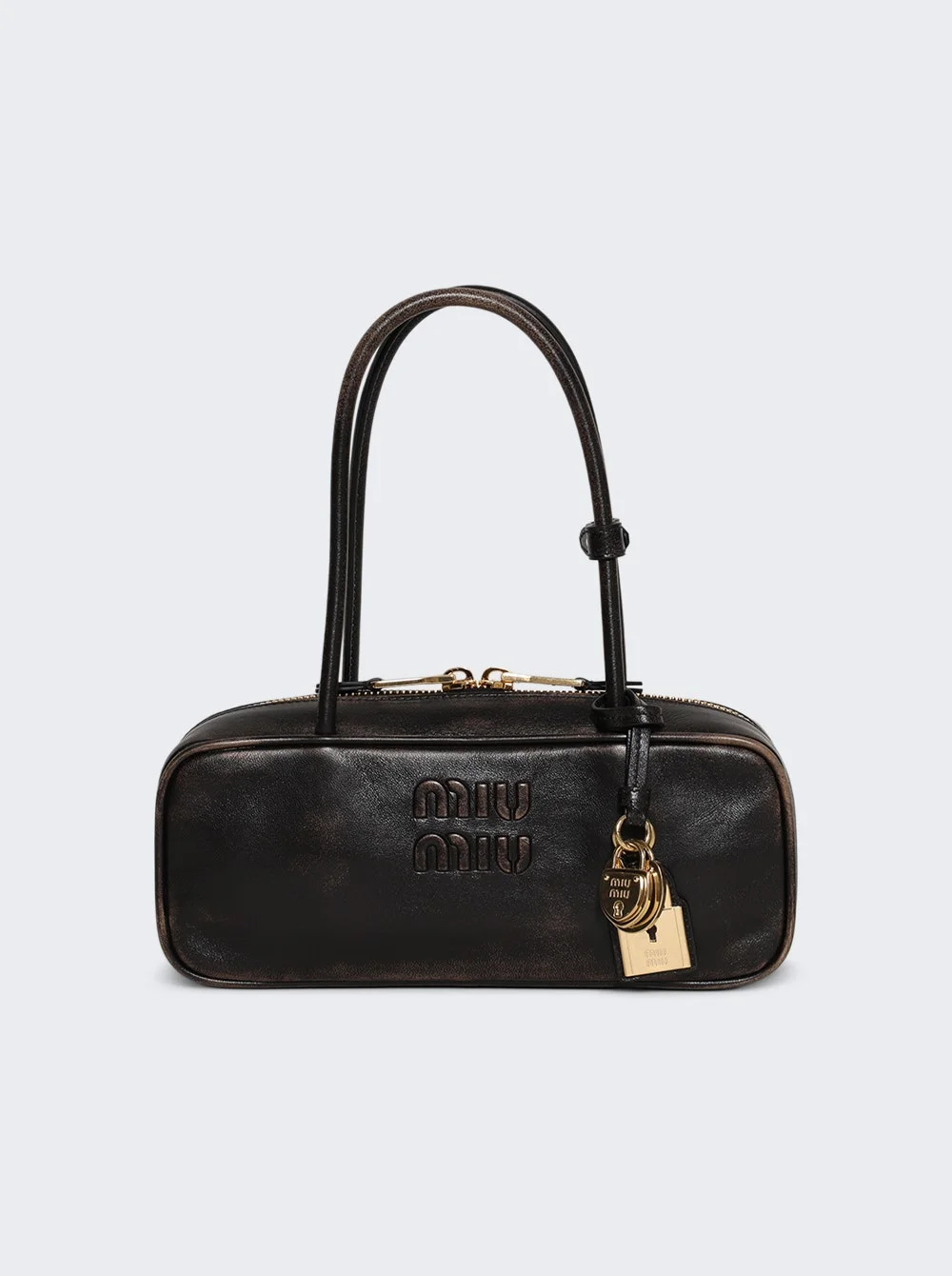 Details - Top-handle bag in vintage-effect Nappa leather - Elongated silhouette - Leather handles - Removable trick - Gold-tone hardware - Zipper closure - Cotton satin lining with zipper pocket - Embossed lettering logo on the front - Material: Lambskin Leather Size Information: Vendor Color Code: Brand Style: 5BB173 V OTM AF6P Designer/Brand: MIU MIU
