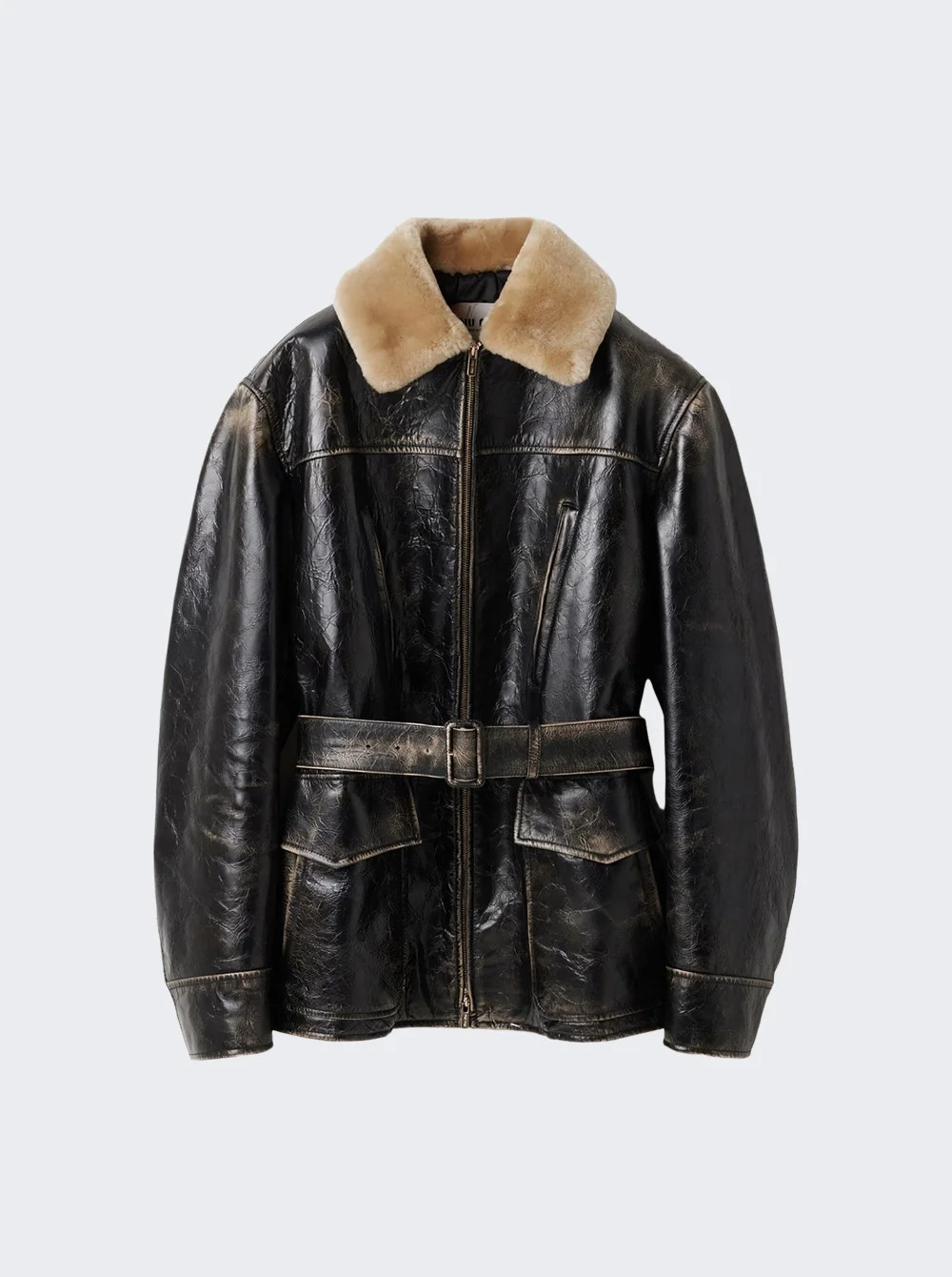 Details - Regular fit - Long sleeves - Zip closure - Shearling collar - Zip closure - Flapped patch pockets - Welt zipper pockets - Embossed lettering logo - Belted - Care according to label - Material: Calf leather Vendor Color Code: Brand Style: MPS763 S OOO 18BU Designer/Brand: MIU MIU