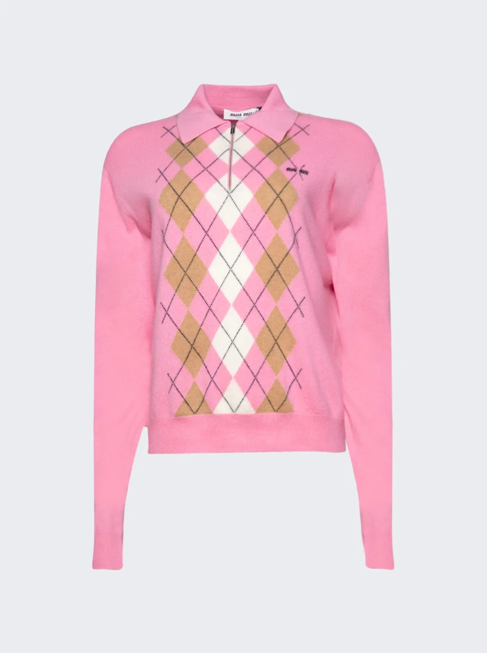 Details - Half-zip cashmere polo sweater - Argyle intarsia knit - Regular fit, long sleeves - Semi-raglan shoulder - Ribbed knit cuffs and hem - Intarsia logo - Material: 100% Cashmere Vendor Color Code: Brand Style: MMLB70 S OOO 174B Designer/Brand: MIU MIU