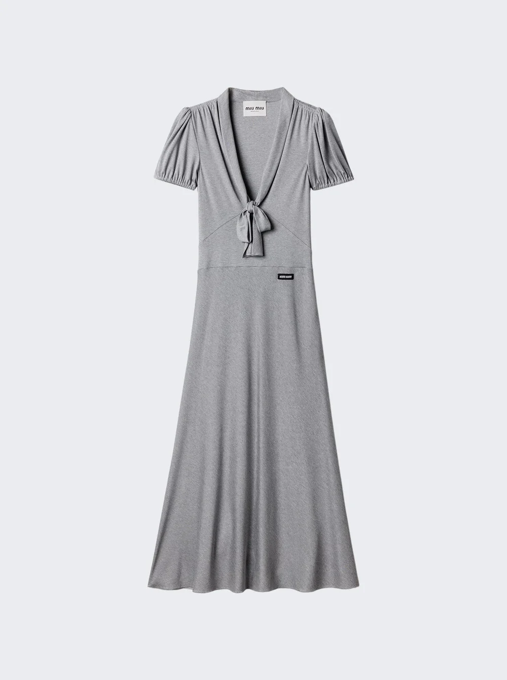 Details - Regular fit - Midi length - Short sleeves - V-neck with bow - Knit logo label - Care according to label - Material: 100% Recycled Silk Vendor Color Code: Brand Style: MF6161 S OOO 13WN Designer/Brand: MIU MIU