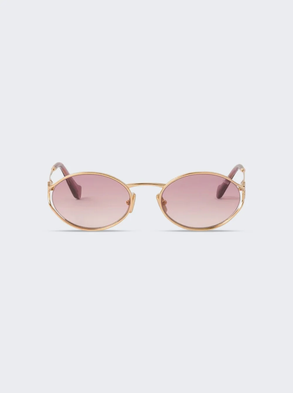 Details - Metal frame oval sunglasses - Thin metal rims that separate from the lenses - Vertical Miu Miu logo integrated into the temple hinge - 100% UVA / UVB protection - Adjustable nose pads - Lens-nose-temple measurements: 54-21-125 mm - Material: Metal Vendor Color Code: Brand Style: 0MU 52YS Designer/Brand: MIU MIU