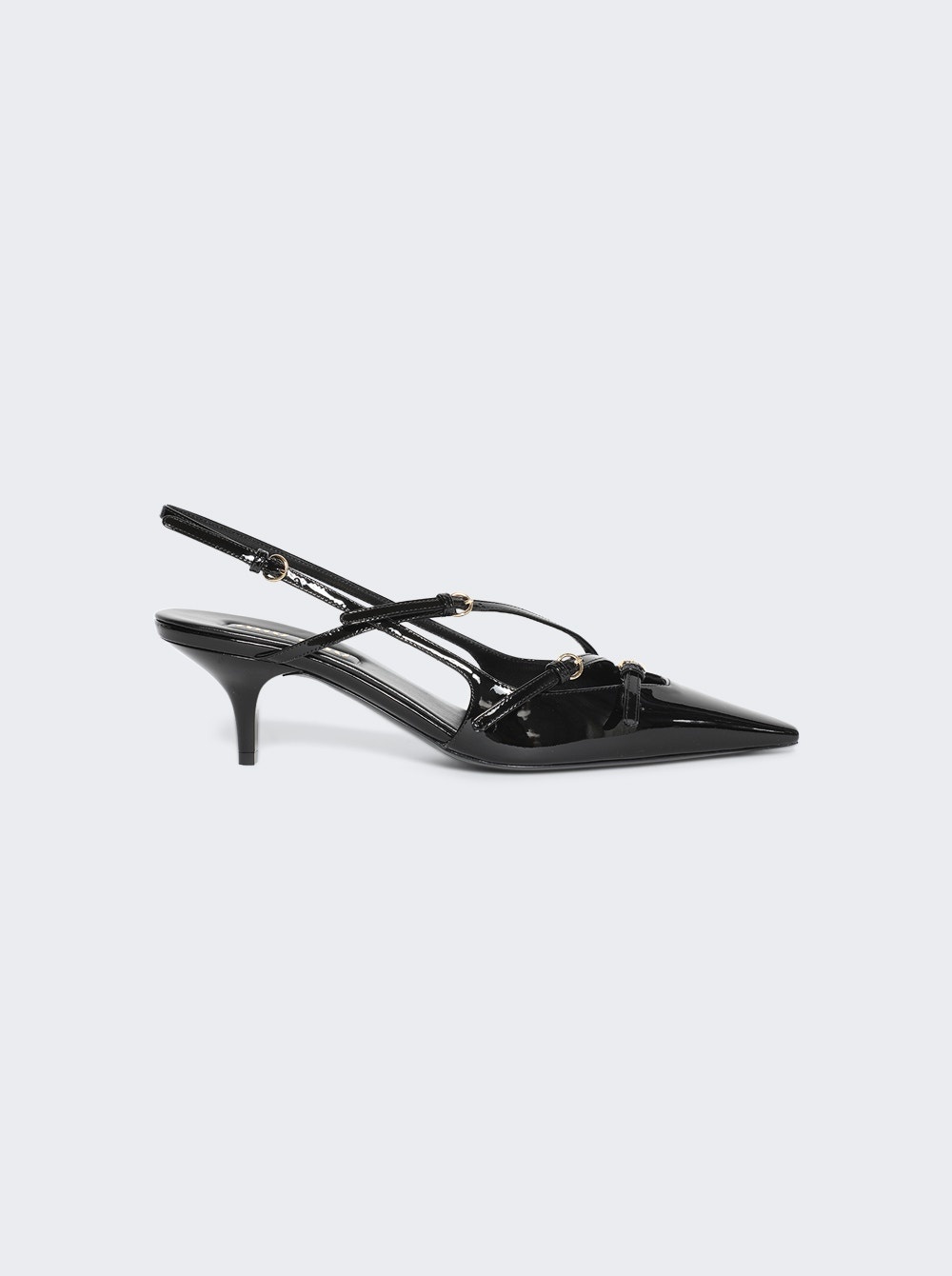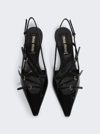 Details - Pointed toe - Upper with metal buckles - Screen-printed logo - Leather sole with rubber heel tip - 55 mm varnished heel Dimensions: Listed in IT sizing. Fits true to size Composition: Upper: Patent Leather; Sole: Rubber Care: Care according to label Brand Style: 5I013E F M055 Designer/Brand: MIU MIU