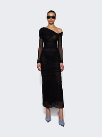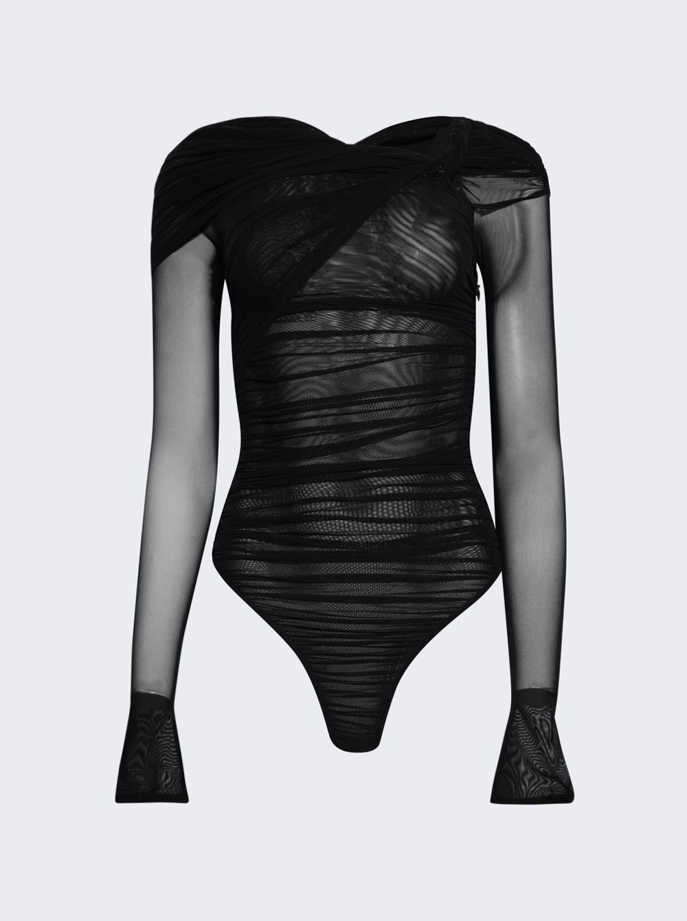 Details - Fitted fit - Bodysuit silhouette - Long sleeves - Off the shoulder neckline with twist detail - Long sleeves - Sheer design - Ruched fabric - Care according to label - Material: 94% Polyamide, 6% Elastane - Model is 5'9"/175cm and is wearing a size FR36 Brand Style: 25P3BO0272595 Designer/Brand: MUGLER
