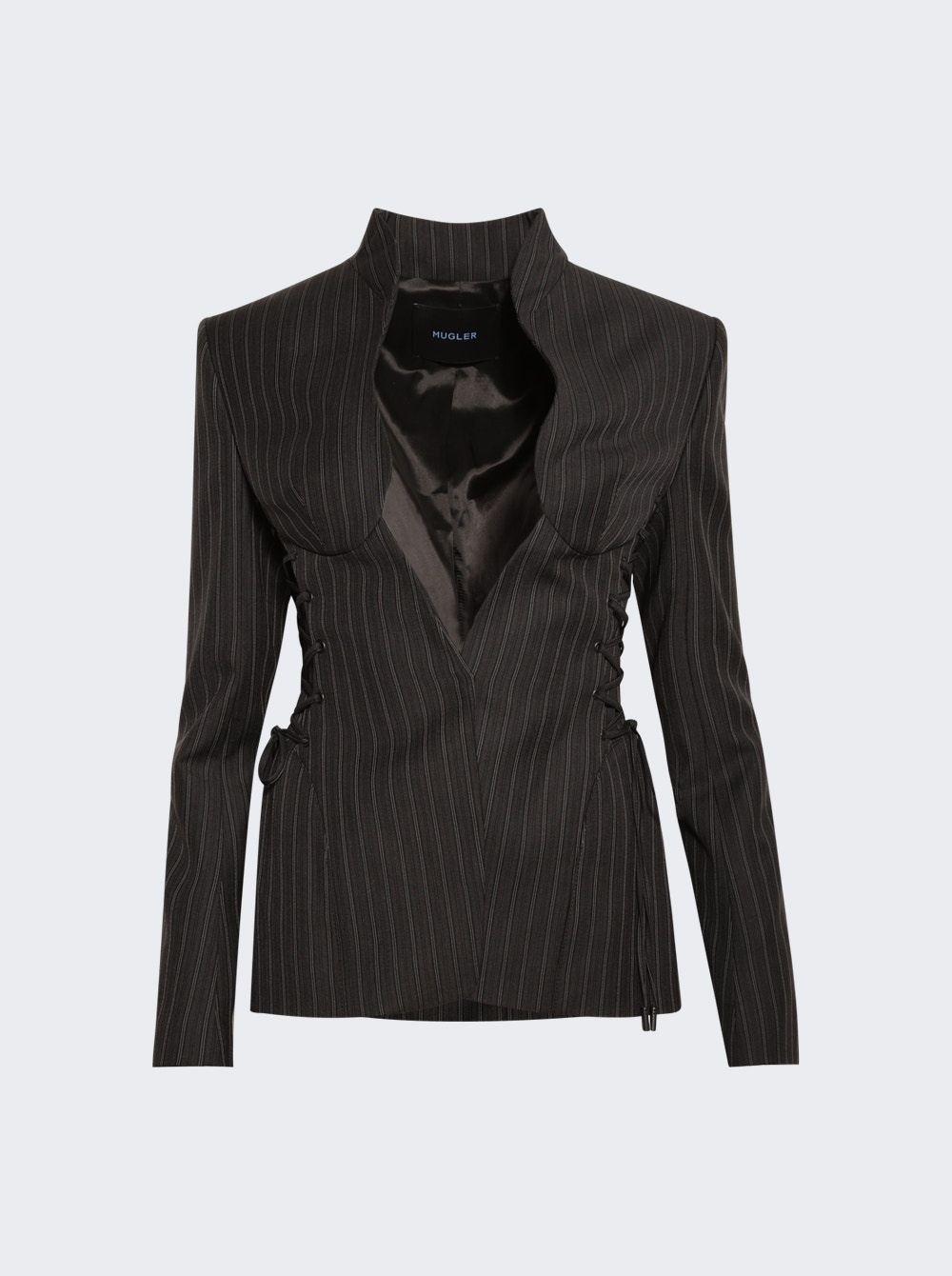 Details - Fitted silhouette - Long sleeves - Open front neckline - Lace detailing on the sides - Pinstripe pattern - Care according to label - Material: 100% Cupro - Model is 5'9"/175cm and is wearing a size FR36 Brand Style: 25P1VE0458194 Designer/Brand: MUGLER