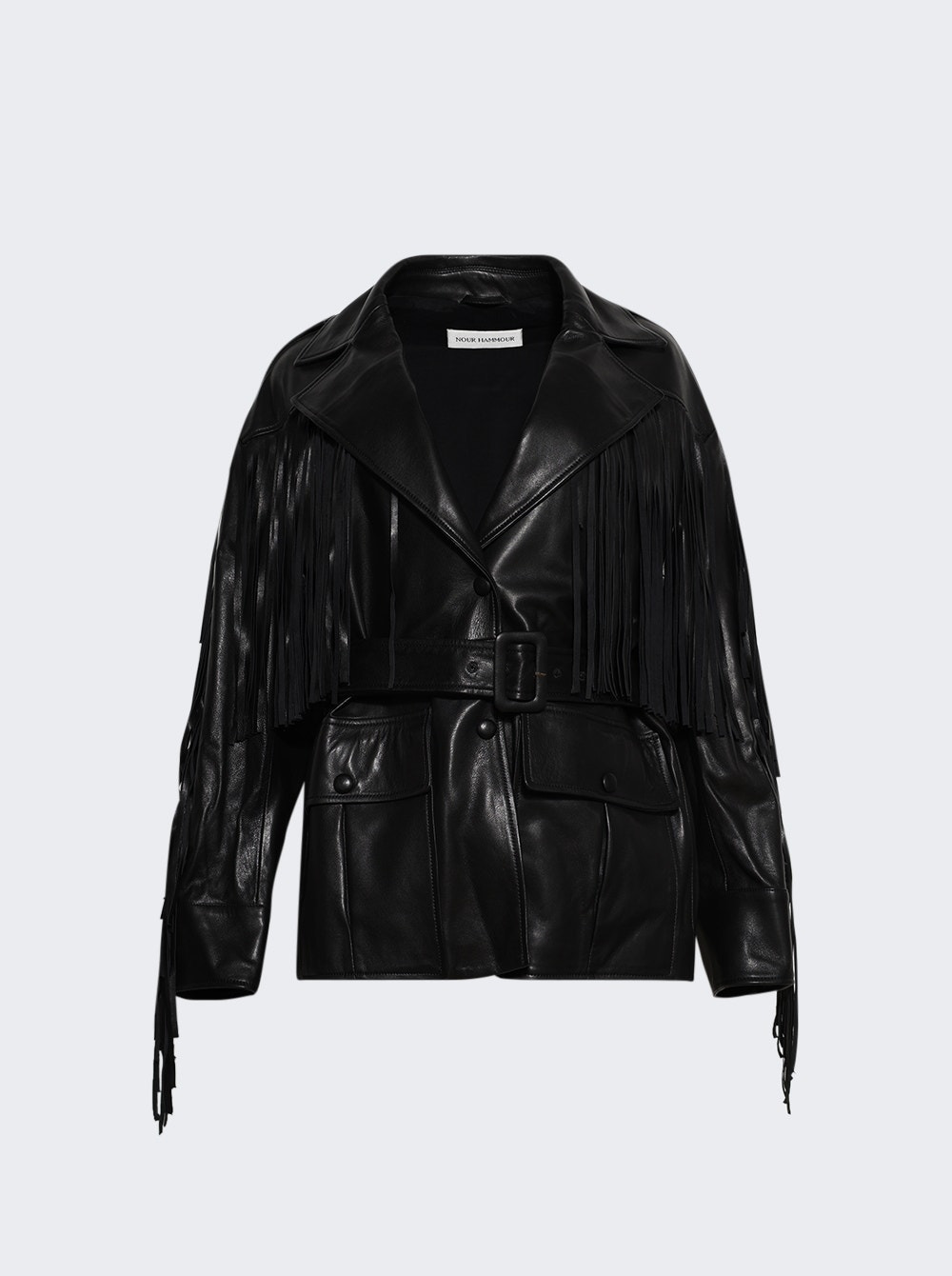 Details - Relaxed leather jacket with a loose fit - Supple leather - Draped in fringe from shoulder to hem - Tonal belt cinches the relaxed silhouette - Notched lapel collar - Two Front Pockets - Material: 100% Goatskin Leather; Body Lining: 63% Cupro, 37% Viscon; Sleeves Lining: 100% Silk Size Information: Vendor Color Code: Brand Style: NH330 - CASSIDY LEATHER Designer/Brand: NOUR HAMMOUR