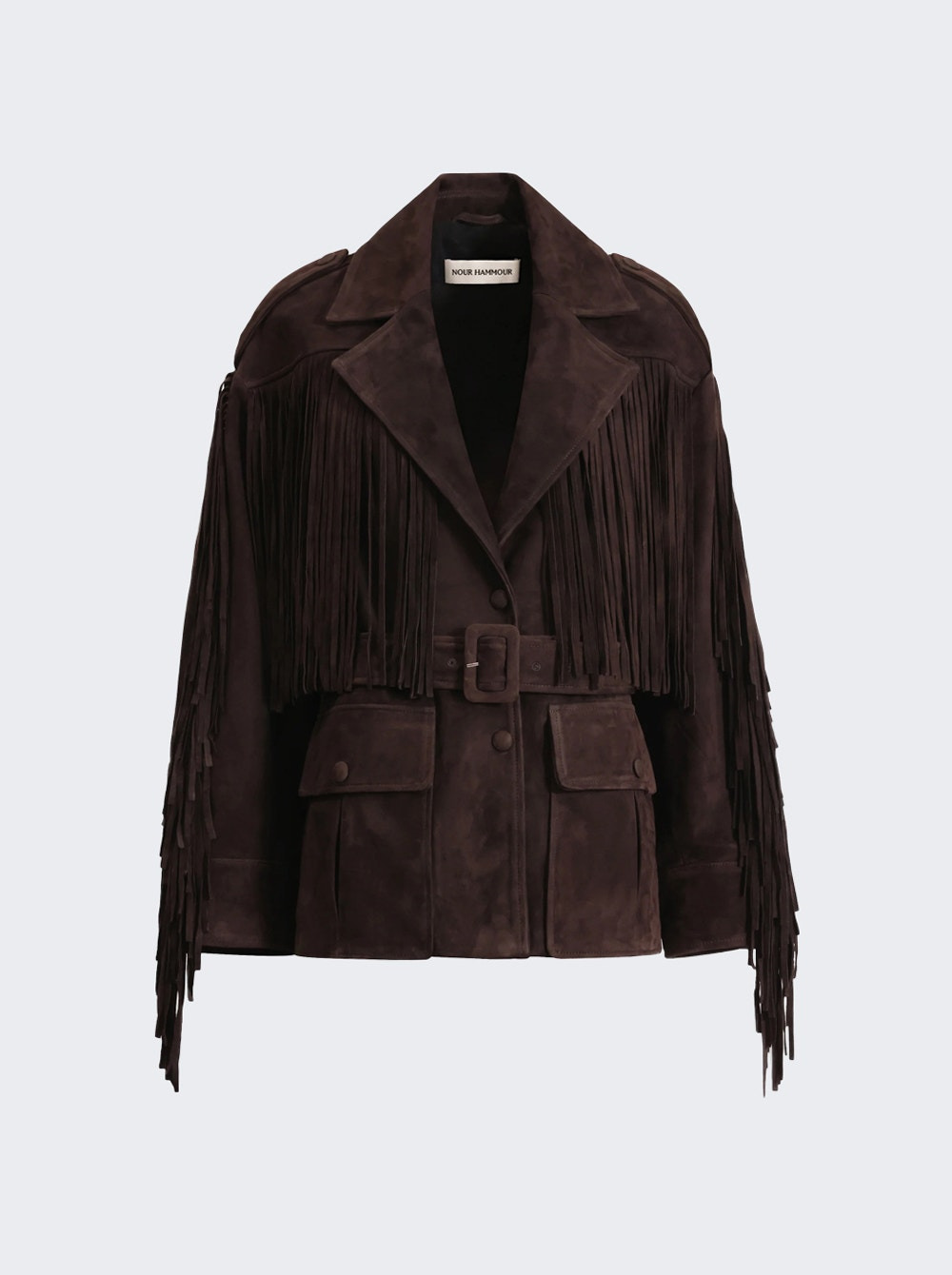 Details - Relaxed suede jacket with a loose fit - Brushed suede leather - Draped in fringe from shoulder to hem - Tonal belt cinches the relaxed silhouette - Notched lapel collar - Two Front Pockets - Material: 100% Goatskin Leather; Body Lining: 63% Cupro, 37% Viscon; Sleeves Lining: 100% Silk Size Information: Vendor Color Code: Brand Style: NH331 - CASSIDY SUEDE Designer/Brand: NOUR HAMMOUR