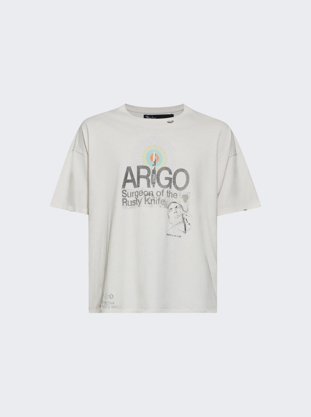 Details - Unisex t-shirt - Boxy, cropped fit - Vintage textured jersey fabric - Heavy enzyme wash process - Minor holes, tears, and distressing throughout - JF original artwork printed throughout - Material: 100% Cotton, Japanese import Size Information: Vendor Color Code: Brand Style: 2U009Q3009VWT Designer/Brand: PALY