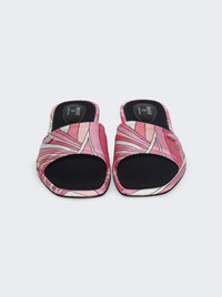 Details - Minimal slide sandals in silk Iride print - Petite logo plaque at the side of the strap - Micro wedge heel - Contoured footbed with logo - Open square toe - Flat leather sole - Silver-tone metal hardware - The all-over print that makes the product unrepeatable. Therefore, the pattern print may vary from the one displayed in the photo. - Material: 100% Silk; Lining: 100% lambskin, Sole: 100% Leather Brand Style: 5HCA03 5H151 Designer/Brand: PUCCI