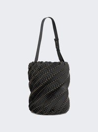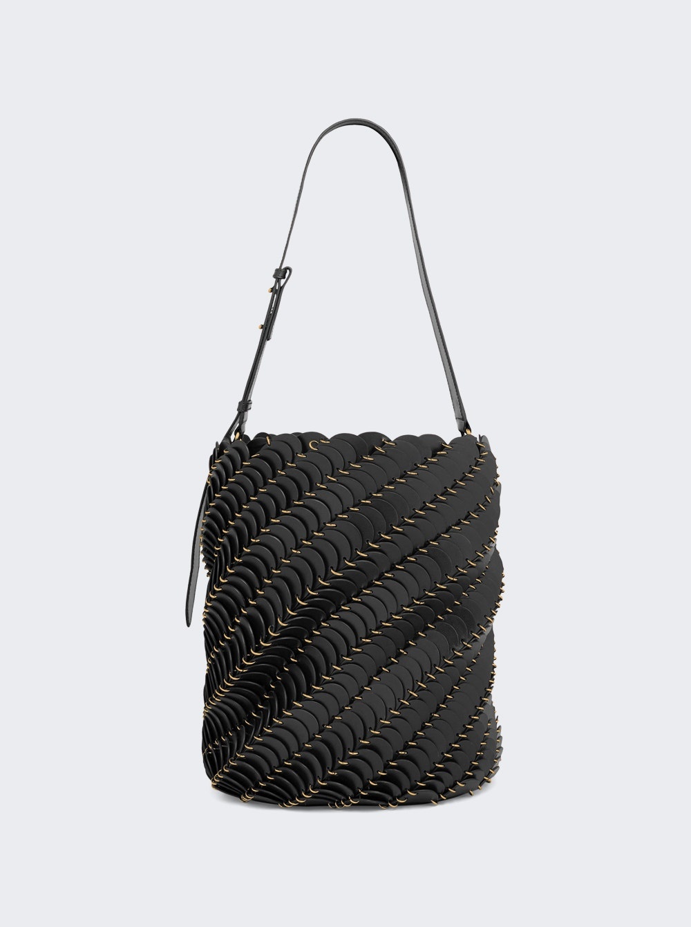 Details - Large bucket bag made with manually-assembled leather chips. - Each leather black chip is cut, polished and painted one by one, then joint together by rings, creating a fluid artisanal twist shaped as a tornado. - The calf leather is tanned in Italy with a smooth finish giving to the bag a classic timeless look. - 100% Box calf skin chips joint together by 100% metallic links. - Made of 800 pieces, manually assembled in 2 days. - Magnetic closure Brand Style: 23HSS0391CLF159 Designer/Brand: RABANNE