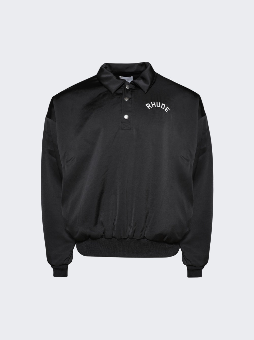 Details - Satin pullover polo - Spread collar - Three-press-stud placket - Logo embroidered at chest - Rib knit hem and cuffs - Seam pockets - Dropped shoulders - Logo and text embroidered at back Dimensions: Model is 6'1"/185cm and is wearing a size M Composition: 100% Polyester Care: Care according to label Brand Style: RHPF24SR02307 Designer/Brand: RHUDE