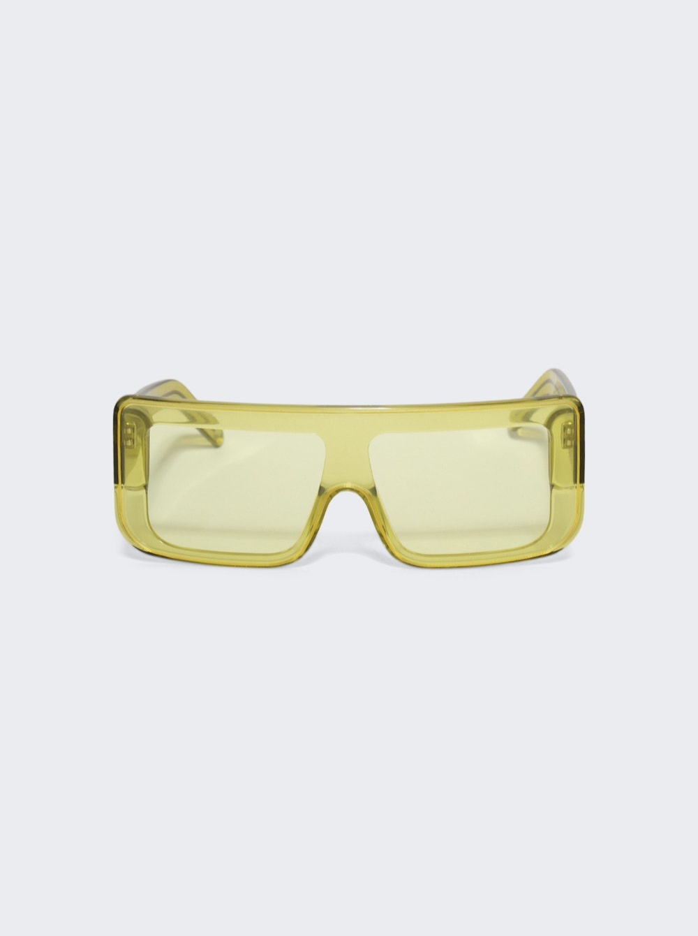 Details - Large acetate square frame sunglasses - Single-cut lens - Wide arms with the signature trio of rivets on each temple - Acid yellow acetate - Acid yellow nylon lenses - Not suitable for prescription lenses Vendor Color Code: Brand Style: RG0000002 GTSACD Designer/Brand: RICK OWENS