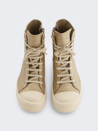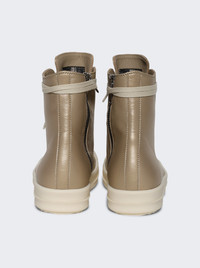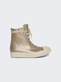 Details - Above-ankle height sneakers - Seven eyelets - Zipper on the inside ankle - Toe caps and shark tooth bumper sole - Lightweight leather with a metallic spray finish - Listed in IT sizing, fits true to size - Material: Lamb leather, Rubber Brand Style: RO01E7890 LLPM Designer/Brand: RICK OWENS