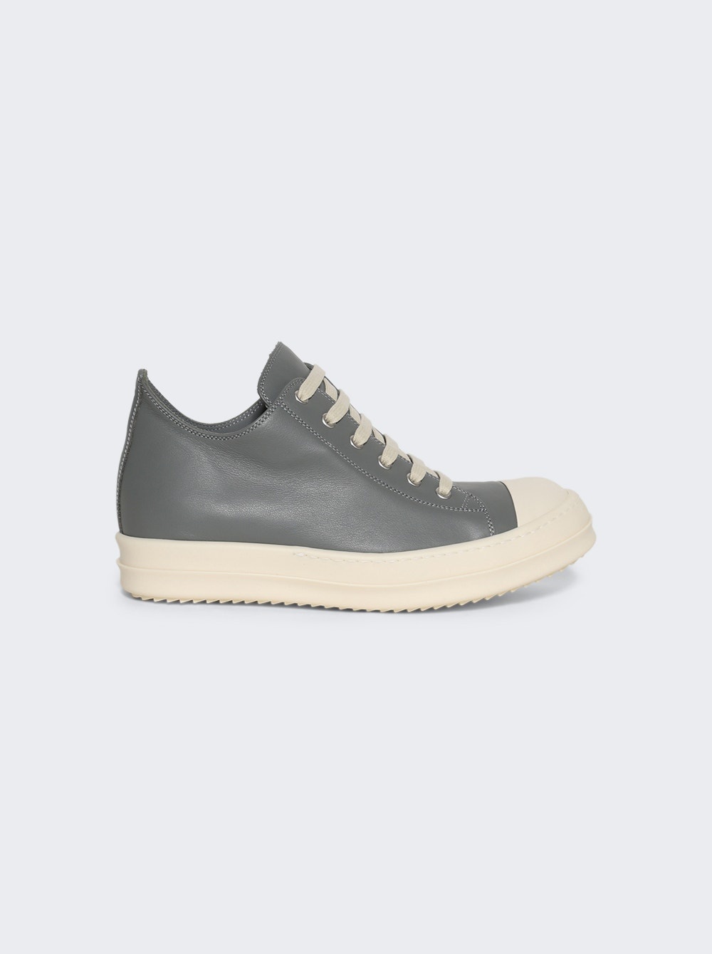 Details - Low top leather sneakers - Six eyelets - Toe caps and shark tooth bumper sole - Lightweight leather - Material: Lamb leather, Rubber Size Information: Vendor Color Code: Brand Style: RP02E4891 LCO Designer/Brand: RICK OWENS