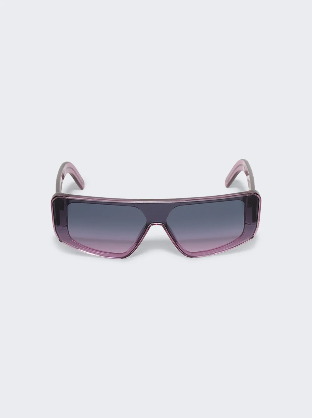 Details - Slim, geometric acetate frame and a single cut nylon lens - Wide arms with the signature silver rivet trio on each temple - logo on the inside right temple - Violet frame and gradient violet lens - Not suitable for prescription lenses - Material: Acetate, Nylon Vendor Color Code: Brand Style: RG0000003 GTSVLT Designer/Brand: RICK OWENS