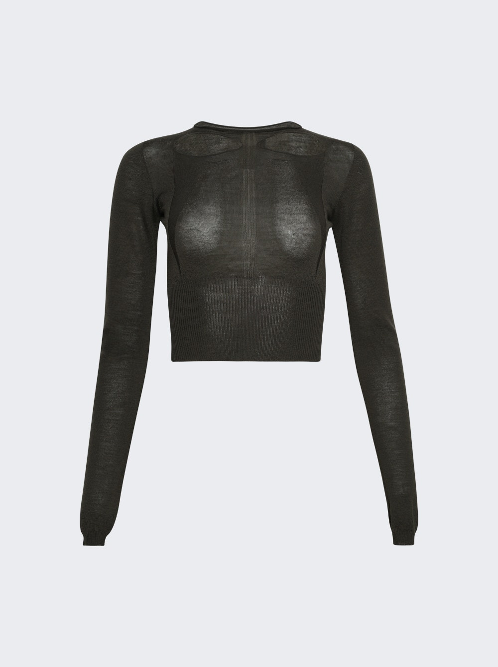 Details - Cropped, slim fit sweater - Rolled, round neckline with slashed at the top - Wide, ribbed waistband - Lightweight wool knit - Material: 100% New Wool Size Information: Vendor Color Code: Brand Style: RP02E4617 ML Designer/Brand: RICK OWENS