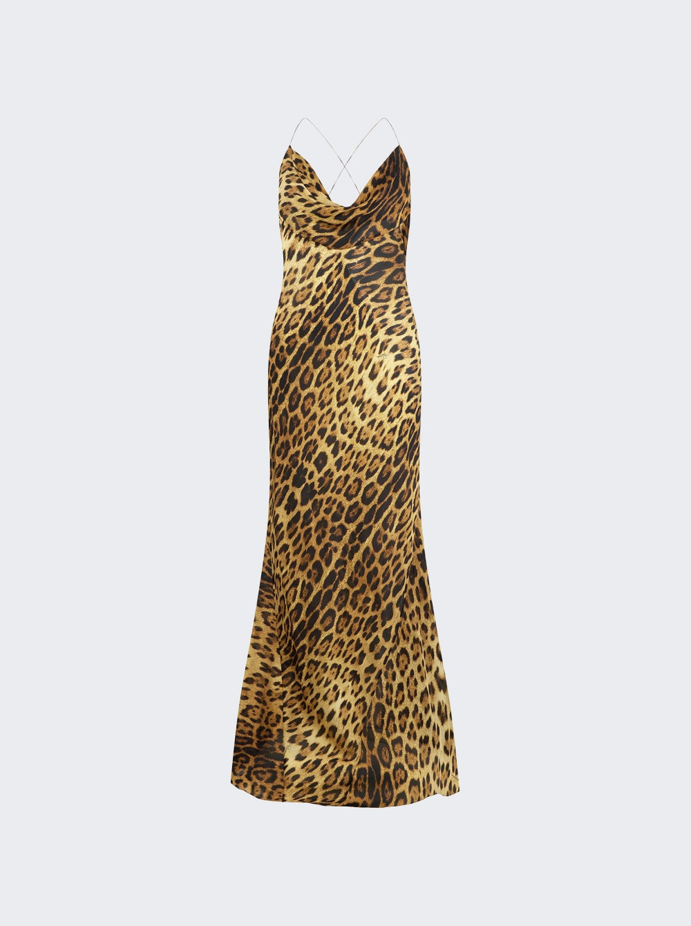 Details - Maxi length - All-over jaguar skin print - Draped neck - Slim crossover straps at the back - Backless - Sleeveless - Care according to label - Material: Silk Size Information: Vendor Color Code: Brand Style: VWT103 HZQ71 00504 Designer/Brand: ROBERTO CAVALLI