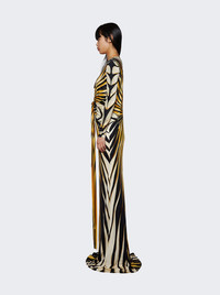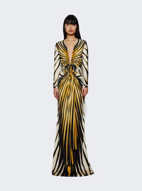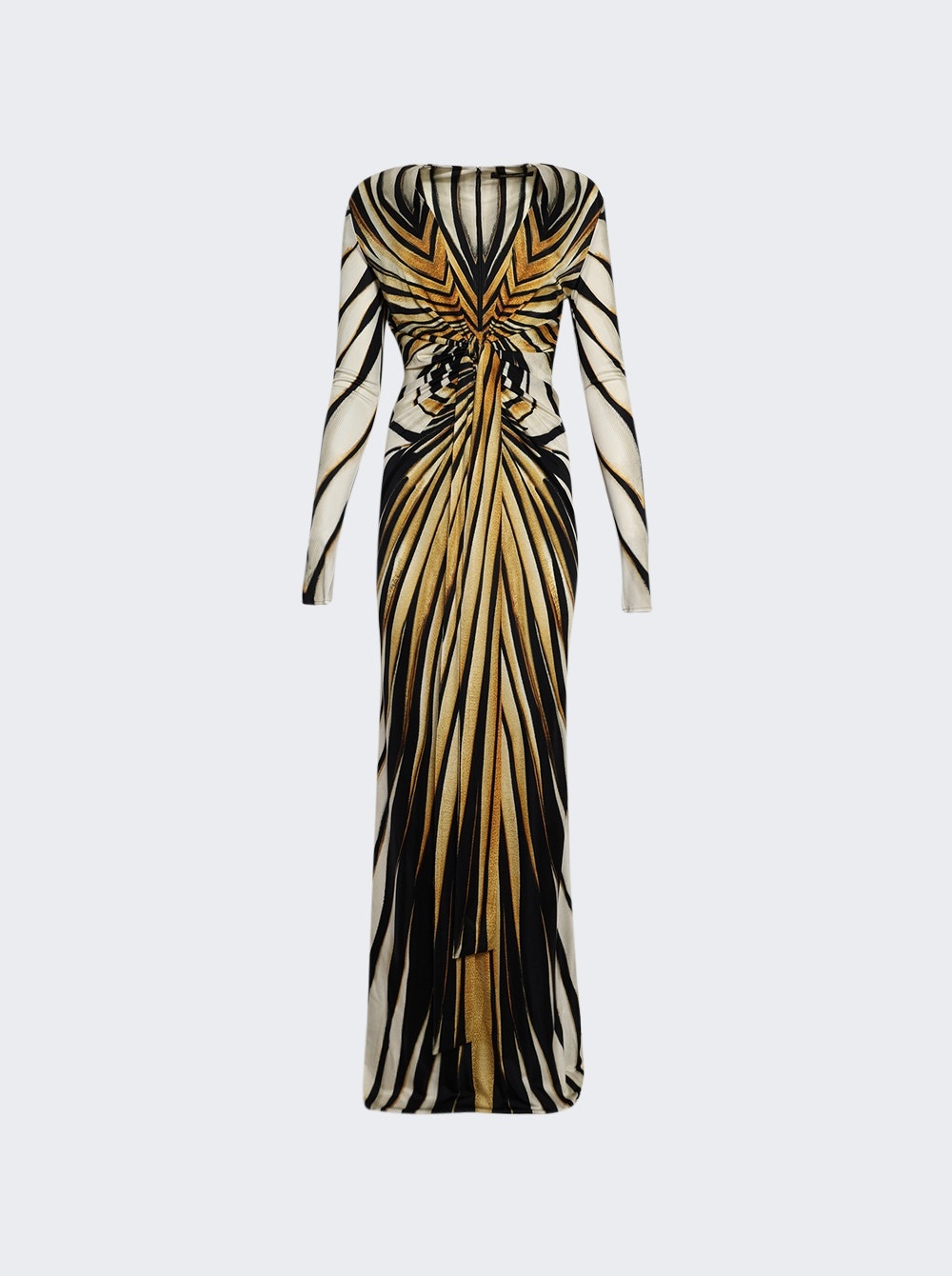 Details - Fitted silhouette - Maxi length - Long sleeves - Ray Of Gold Print - V neckline - Care according to label - Material: 96% Viscose, 4% Elastane - Model is 5'9"/175cm and is wearing a size IT40 Brand Style: TKT107 JRM33 01080 Designer/Brand: ROBERTO CAVALLI