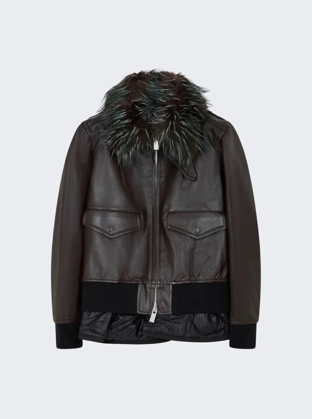 Details - Leather jacket with faux fur collar - Exposed lining at the hem - Storm flap detail - Front zip closure - Front flap pockets - Ribbed trim - Main Material: 100% Cowhide leather Size Information: Vendor Color Code: Brand Style: 25-08238 Designer/Brand: SACAI