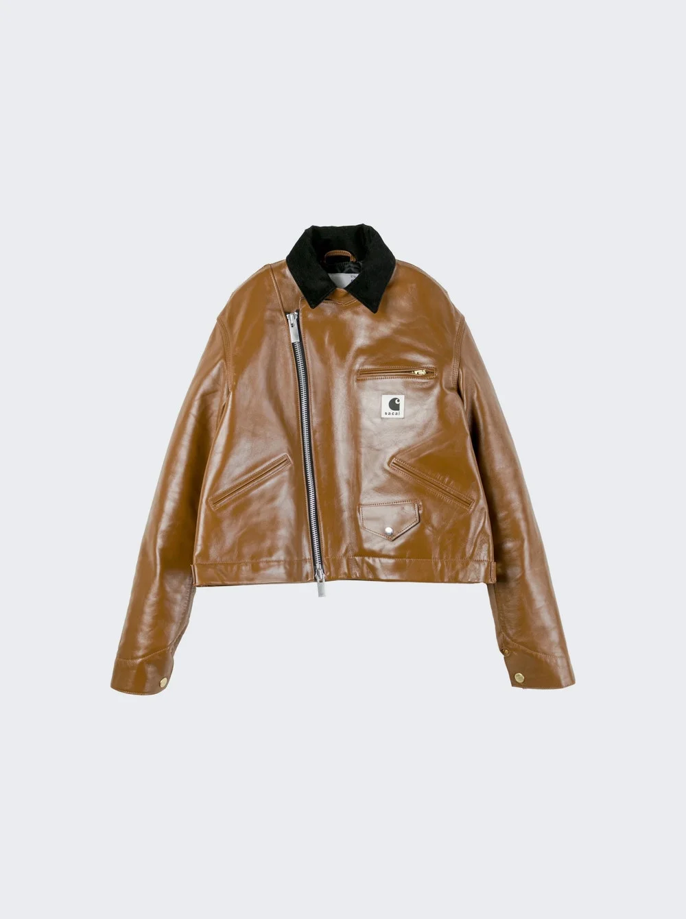 Details - Designed in collaboration with Carhartt WIP, this garment combines Carhartt WIP’s Detroit Jacket with Sacai’s biker jacket. - Sustainably sourced soft leather, LWG-certified - Asymmetric front opening - High layered corduroy collar - Zipped chest pocket, two welt pockets, lower patch pocket - Co-branded woven label - Material: 100% Leather (LWG certified, gold class); 100% Cotton (organic, Dearborn Canvas) Size Information: Vendor Color Code: Brand Style: 25-08082 Designer/Brand: SACAI
