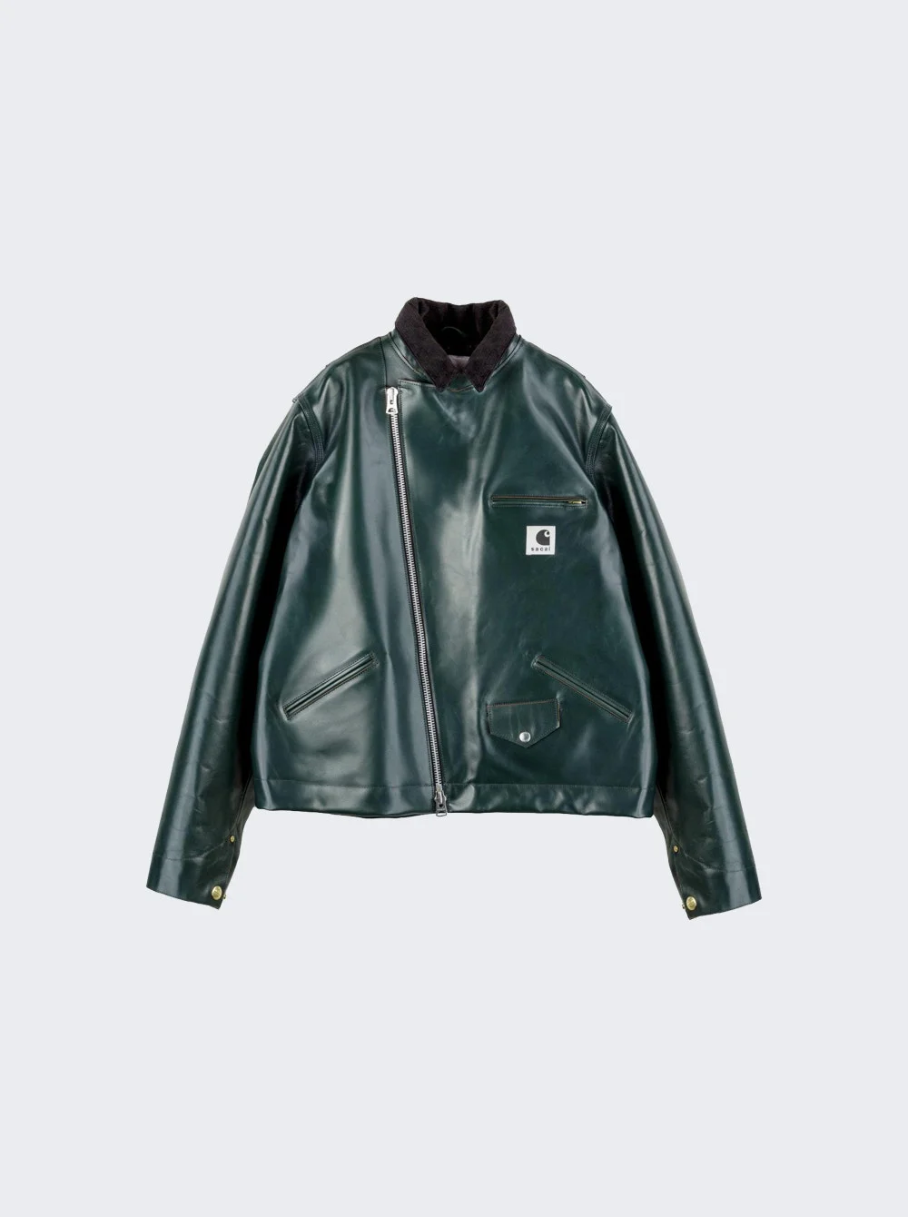 Details - Designed in collaboration with Carhartt WIP, this garment combines Carhartt WIP’s Detroit Jacket with Sacai’s biker jacket. - Sustainably sourced soft leather and LWG-certified - Asymmetric front opening - High layered corduroy collar - Zipped chest pocket, two welt pockets, lower patch pocket - Co-branded woven label - Material: 100% Leather (LWG certified, gold class); 100% Cotton (organic, Dearborn Canvas) Size Information: Vendor Color Code: Brand Style: 25-08082 Designer/Brand: SACAI