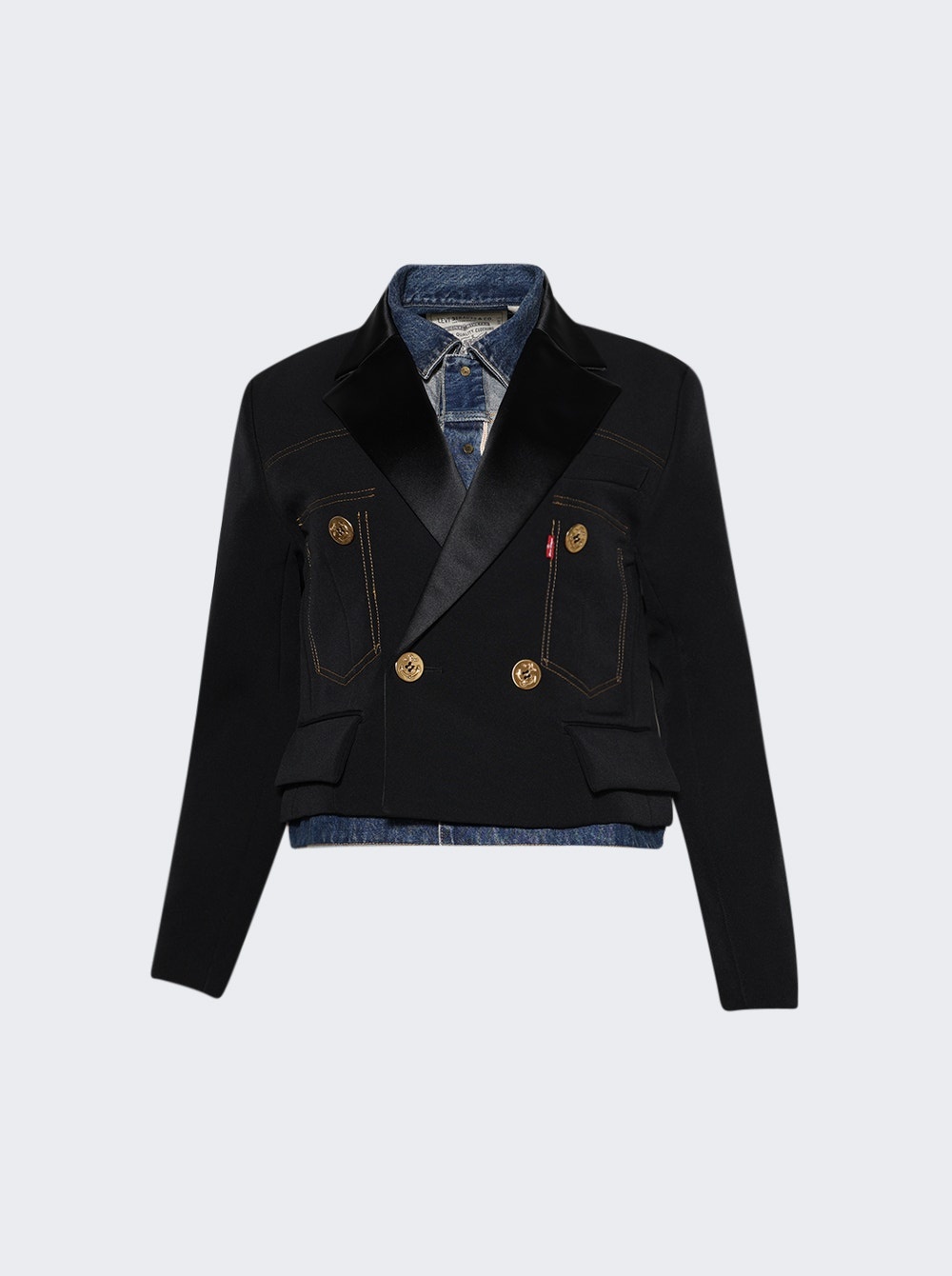 Details - Designed in collaboration with Levi's - Combo jacket with denim and matelassé twill - Tailored suit jacket overlay - Front flap pockets - Notch lapels - Button front closure - Material: 90% Wool, 10% Polyamide; 100% Cotton; 100% Polyester Size Information: Vendor Color Code: Brand Style: 25-07780 Designer/Brand: SACAI