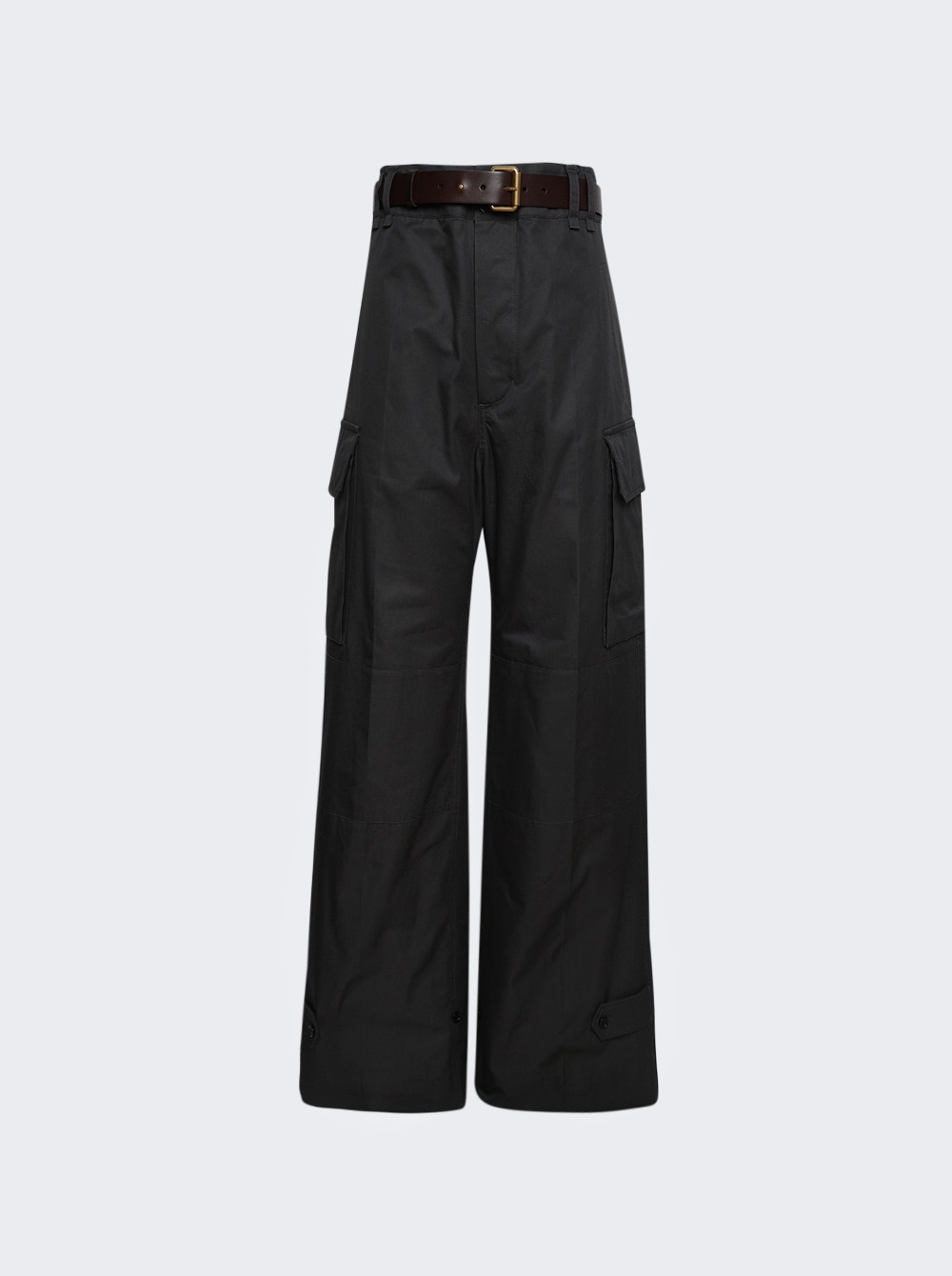 Details - Wide-leg belted cargo pants - Organic cotton twill - High-waist - Center crease - Cassandre embroidery at the side pocket - Cotton lining - Button fly - Two slash pockets at the front - Two bellow pockets with snap-button flap at the sides - Two welt pockets with snap-button flap at the back - Waistband with belt loops - Removable pin-buckle leather belt - Button-tab cuffs Dimensions: Model is 5'9"/175cm and is wearing a size FR36 Composition: 100% Cotton Care: Care according to label Brand Style: 789857 Y3A99 Designer/Brand: SAINT LAURENT