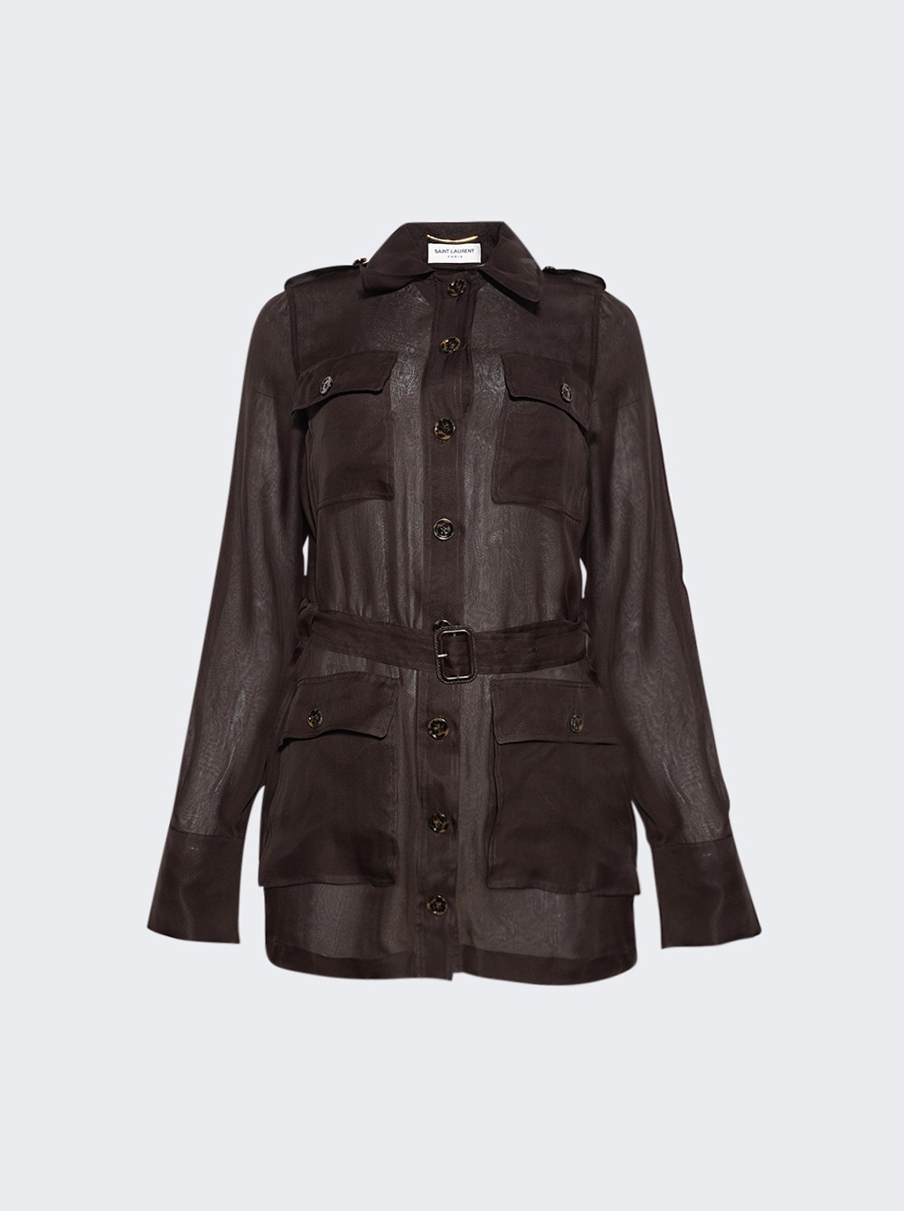 Details - Regular fit - Long sleeve - Classic collar - Multi pockets - Button closure - Removable belt at the waist - Semi sheer construction - Care according to label - Material: 100% Silk - Model is 5'9"/175cm and is wearing a size FR36 Brand Style: 778923 Y065W Designer/Brand: SAINT LAURENT