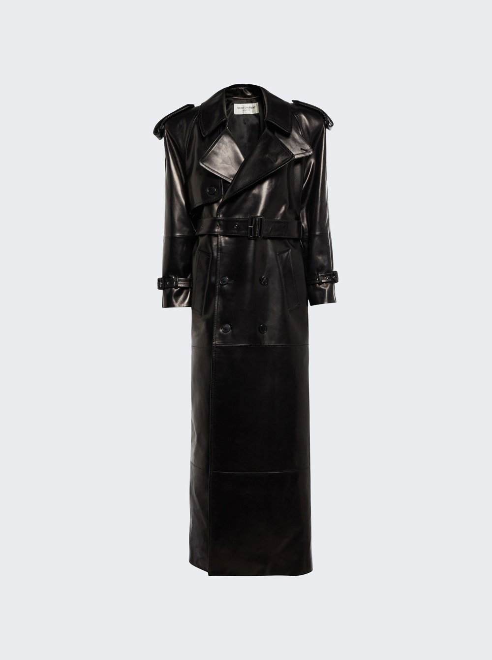 Details - Long trench coat - High-shine effect - Oversized notch lapel Dimensions: Model is 5'9"/175cm and is wearing a size FR36 Composition: 100% laminated drill cotton Care: care according to label Brand Style: 753925Y6H66 Designer/Brand: SAINT LAURENT