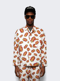 Details - Spread collar - Button-up closure - Front pouch pocket - Straight hem - Comic Saint graphic print allover Dimensions: Model is 6'1"/185cm and is wearing a size M Composition: cotton Care: Care according to label Brand Style: SM-A22-0000-027 Designer/Brand: SAINT MICHAEL