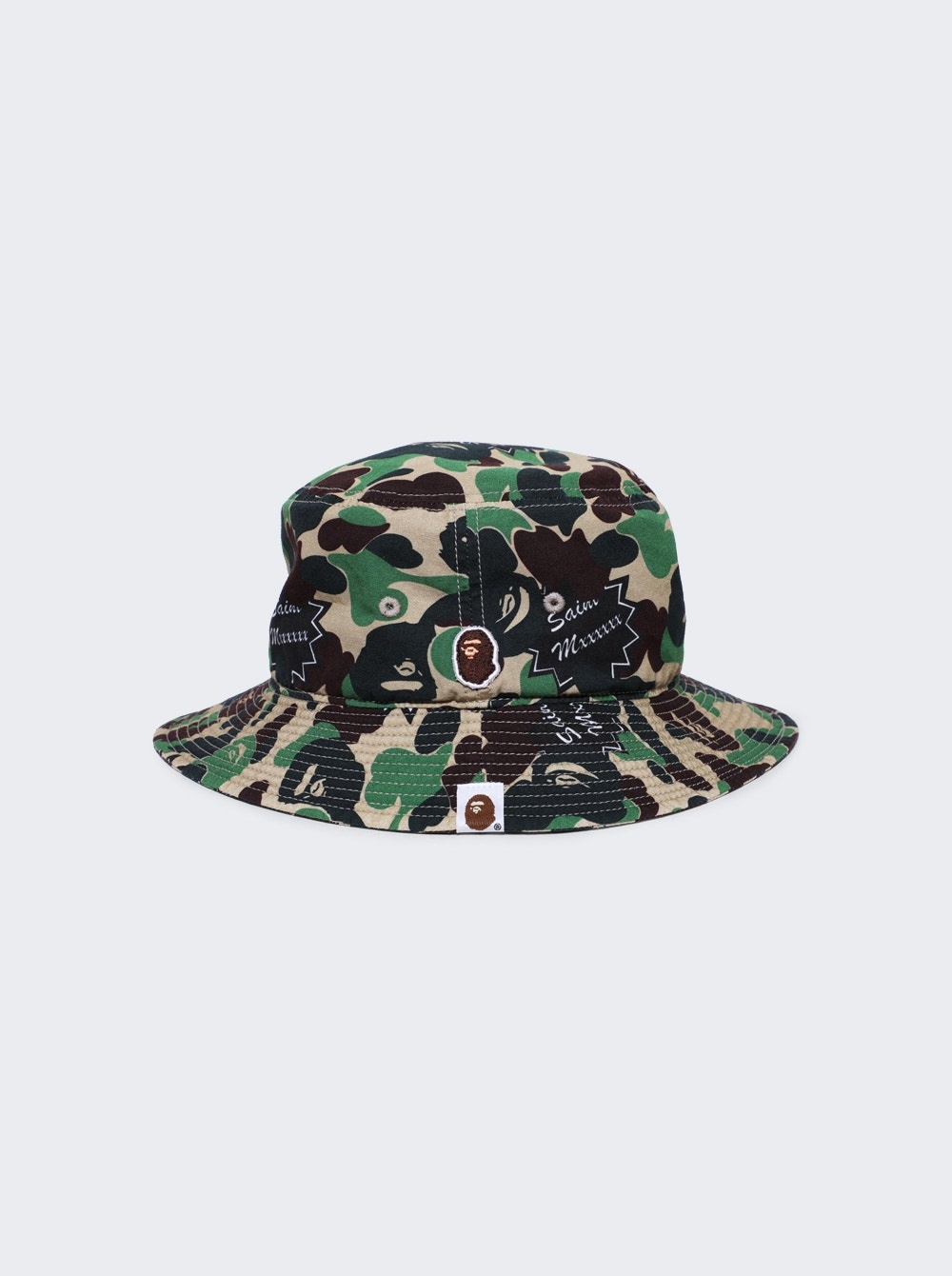 Details - Classic cotton bucket hat - Front embroidered BAPE patch - Sloped embroidered brim - Camouflage print - SAINT Mxxxxxx logos throughout Dimensions: One size Composition: 100% Cotton Care: Care according to label Brand Style: SM-YS8-0000-C31 Designer/Brand: SAINT MICHAEL