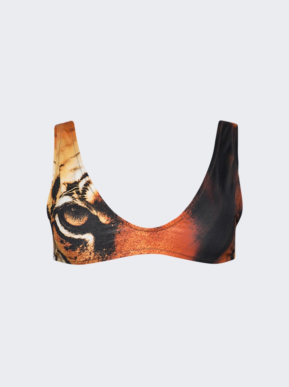 Details - Designed in collaboration with Roberto Cavalli - Signature SKIMS Plunge Bikini Top reimagined in Cavalli's bold, luxurious tiger print - Pullover swim top with a low scoop neckline - Material: 76% Recycled Nylon, 24% Elastane Size Information: Vendor Color Code: Brand Style: BT-PLG-7500WC Designer/Brand: SKIMS