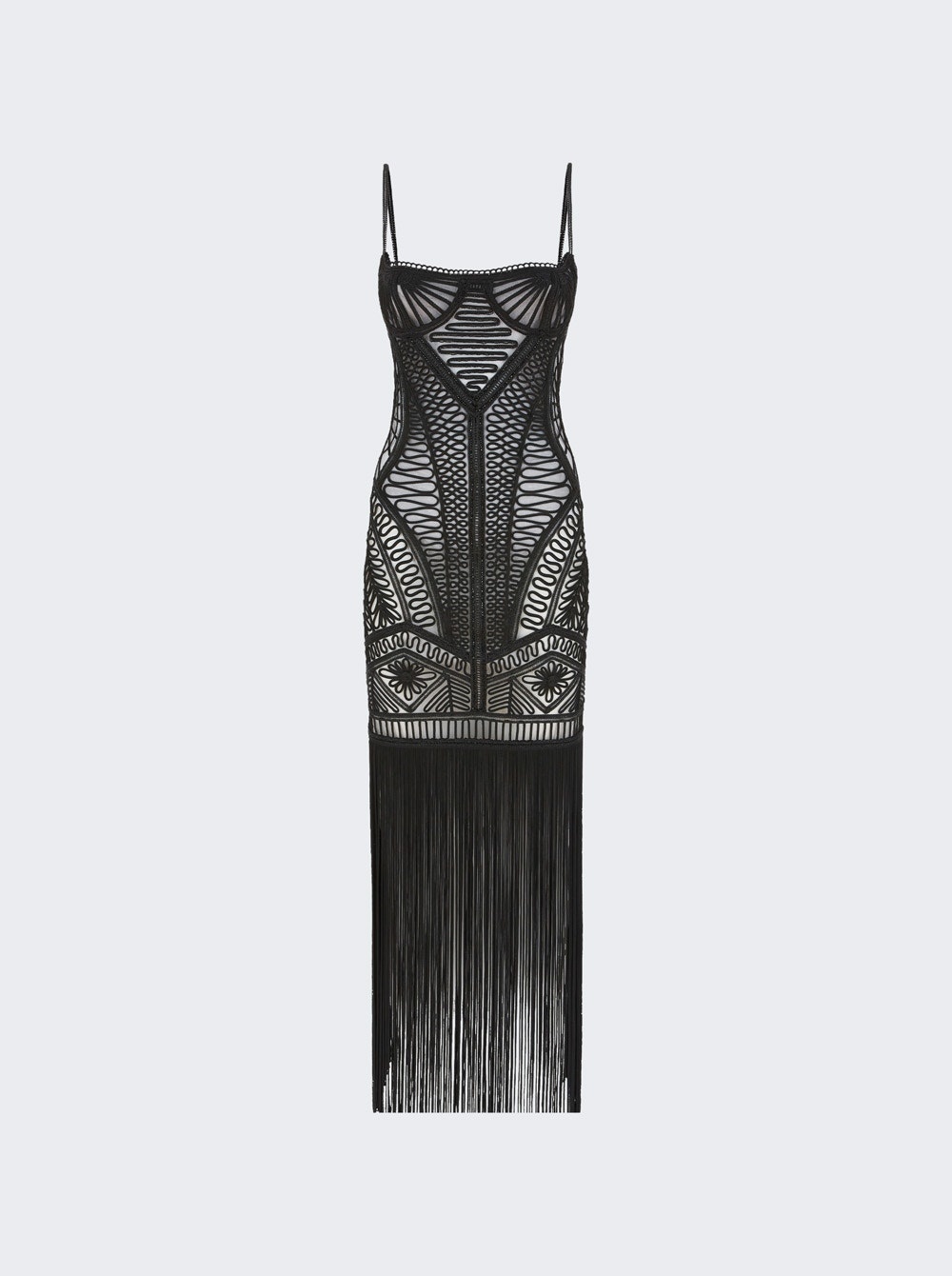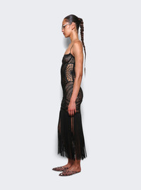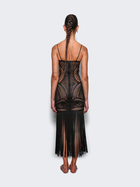 Details - Black geometric embroidered tulle - See-through design - Scoop neckline - Thin straps - Long fringe at hem - Model is 5'9"/175cm and is wearing a size FR36 - Main material: 69% polyamide, 31% lycra - Fringe: 100% viscose - Embroidery: 100% polyester Brand Style: 250WCW00202 PLL001RA Designer/Brand: THE ATTICO