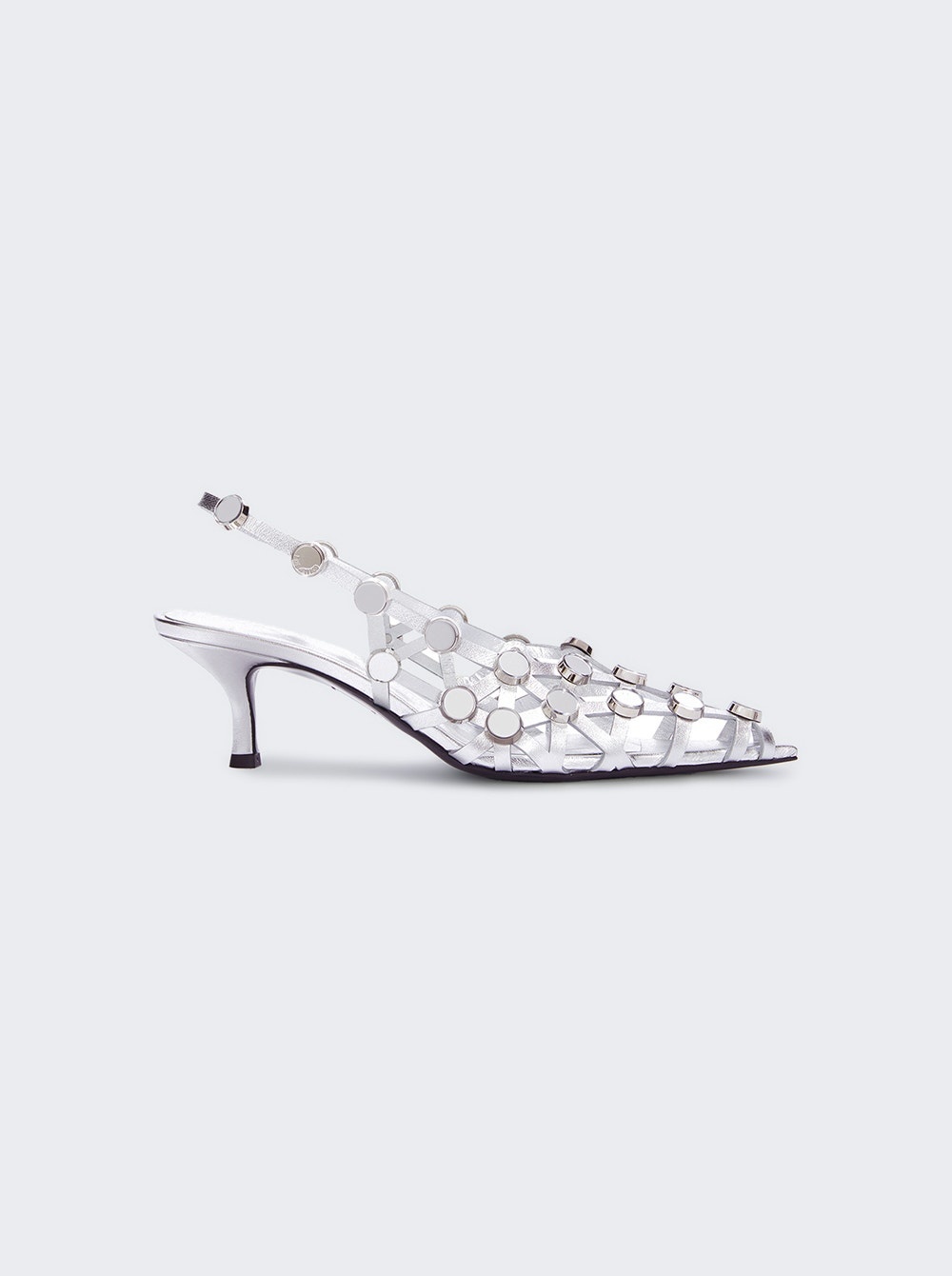 Details - Low heel slingback pumps - Open grid design - Silver metallic nappa leather - Mirror detailing - Heel height: 50mm / 2in - Listed in IT sizing, fits true to size Brand Style: 250WSH00844 LBT112SA Designer/Brand: THE ATTICO