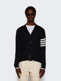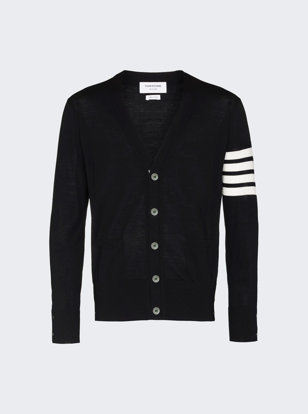 Details - V-neck, relaxed-fit cardigan - Jersey stitch - 4-bar detailing - Front button closure with signature striped grosgrain placket - Front slip pockets - Tipping hem - Buttoned cuffs and side vents with signature striped grosgrain trim - Signature striped grosgrain loop tab Brand Style: MKC002D-Y1014 Designer/Brand: THOM BROWNE
