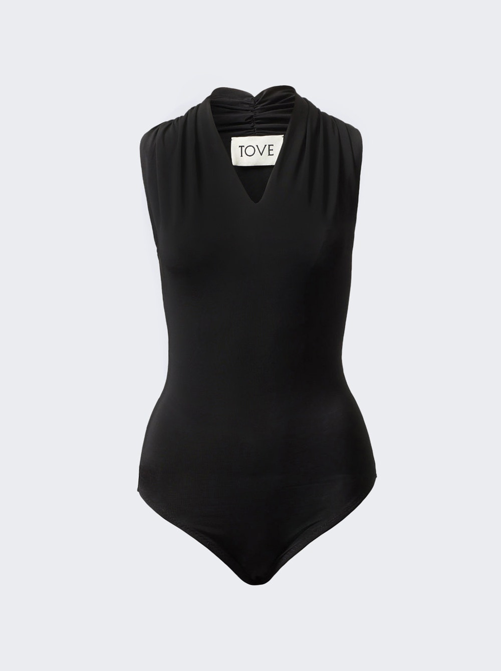 Details - Stretchy sleeveless bodysuit - Gathered detailing at the neck - Deep V neckline - Sustainably sourced Italian crepe jersey - Care: Dry clean only - Material: 95% Viscose, 5% Elastane Size Information: Vendor Color Code: Brand Style: TVE022BLK Designer/Brand: TOVE