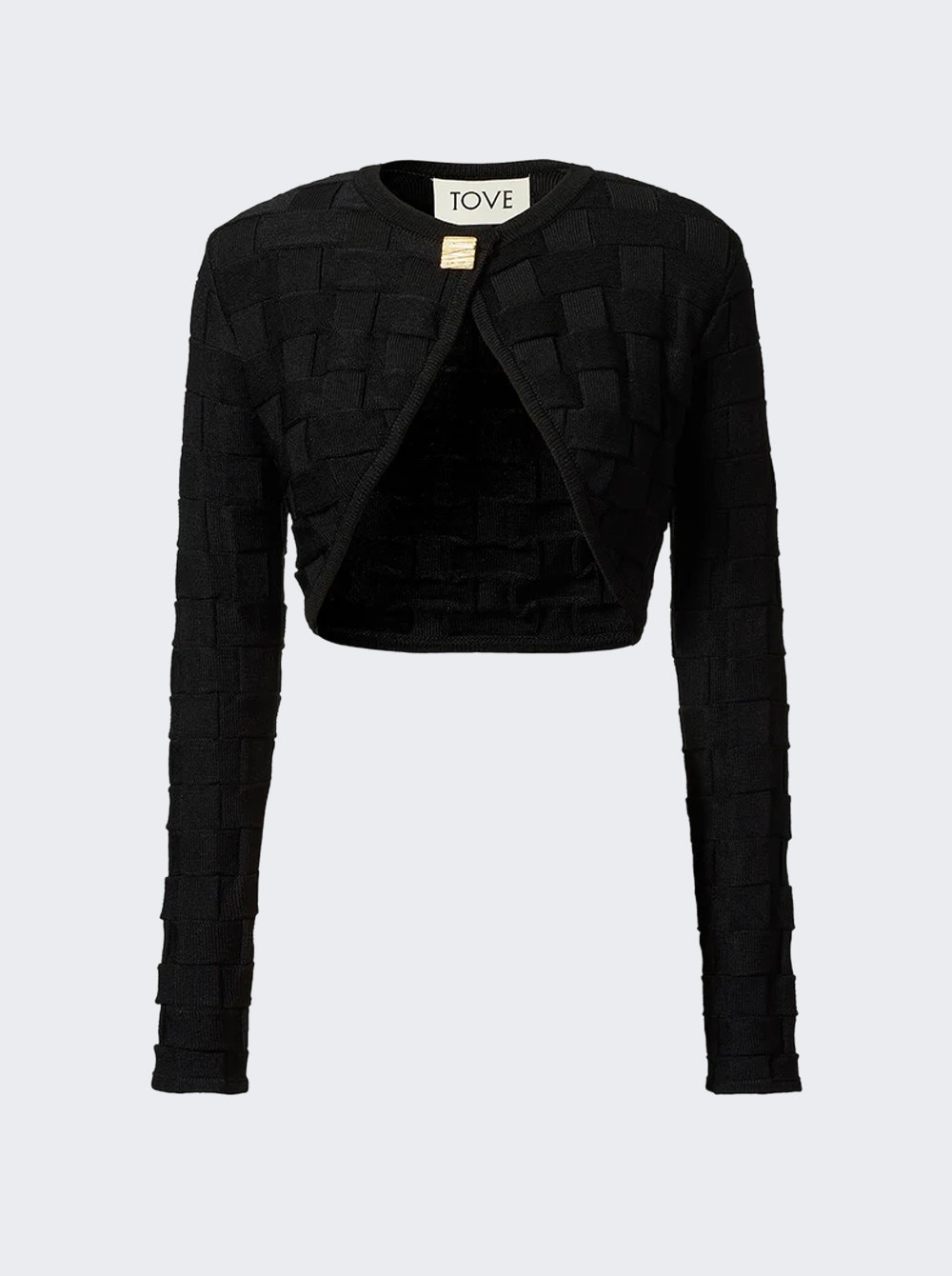 Details - Long sleeve knitted top - Crafted in an Italian viscose yarn with a textural basket weave stitch design and delicately soft luster - Fastened by a signature textured golden button - Model is 5'9"/175cm and is wearing a size S - 83% Viscose, 17% Polyester Elite Brand Style: TVN007BLK Designer/Brand: TOVE