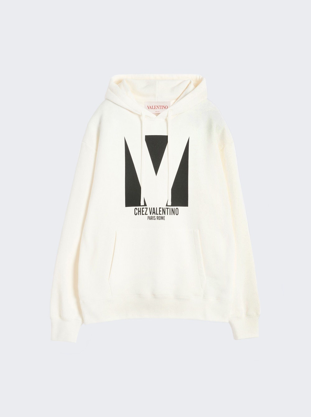 Details - Loose fit - Long sleeves - Drawstring hood - Printed Chez Valentino on the front - Ribbed cuffs and hemline - Kangaroo pockets - Care according to label - Material: 100% Cotton - Model is 6'1"/185cm and is wearing a size M Brand Style: 6V3MF28NAQA Designer/Brand: VALENTINO GARAVANI