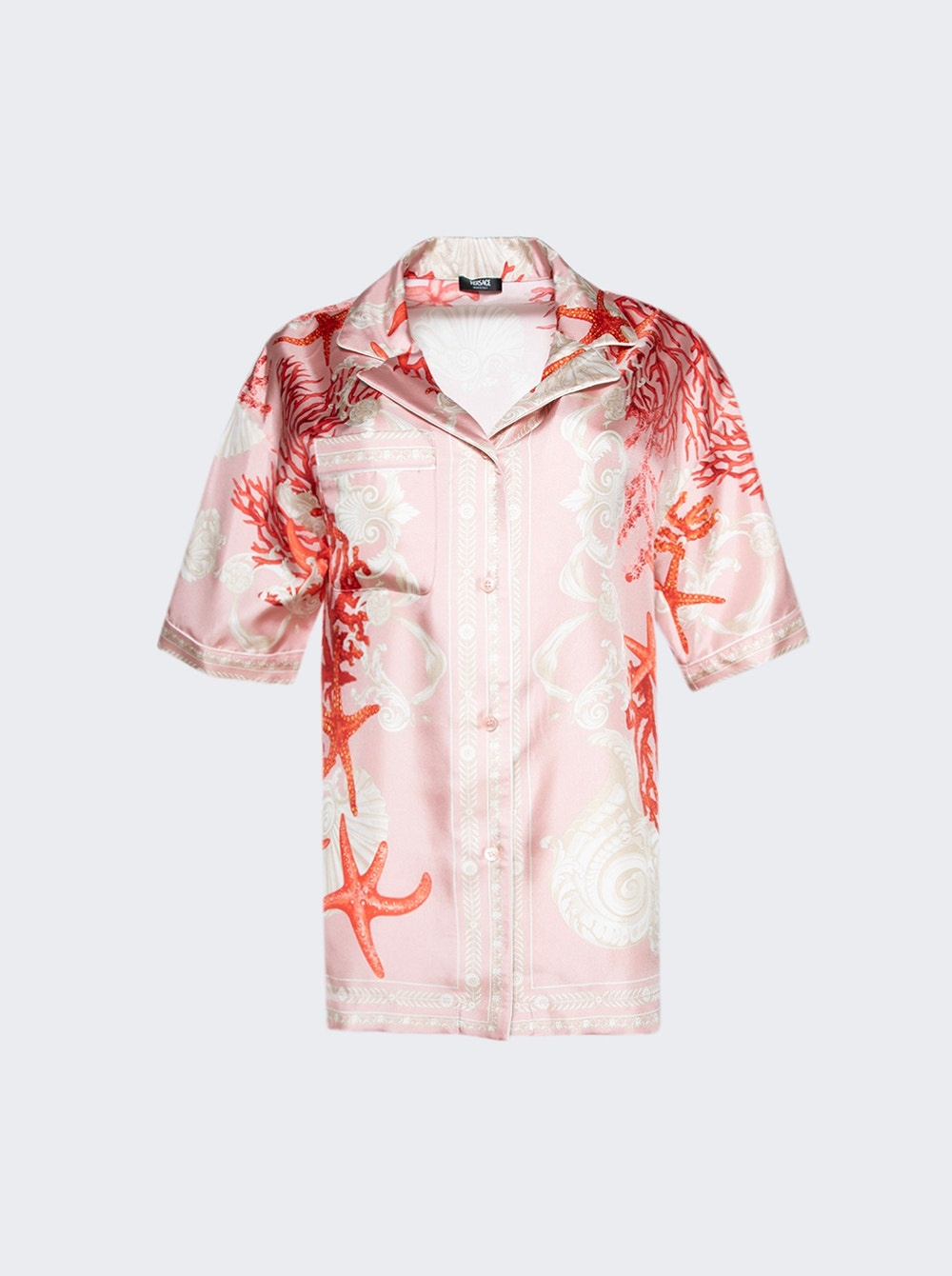Details - Barocco Sea print - Short sleeves - Notched collar - Front button closure - Chest patch pocket Dimensions: Model is 5'9"/175cm and is wearing a size IT40 Composition: 100% Silk Care: Care according to label Brand Style: 1016803_1A11526 Designer/Brand: VERSACE