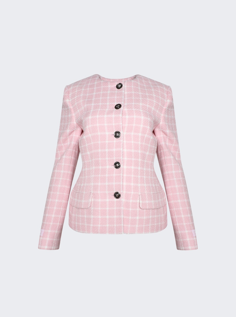 Details - Tailoring label - Long sleeves - Collarless - Front button closure - Buttoned cuffs - Front flap pockets Dimensions: Model is 5'9"/175cm and is wearing a size IT40 Composition: 89% Wool, 11% Nylon Care: Care according to label Brand Style: 1014630 1A10442 Designer/Brand: VERSACE