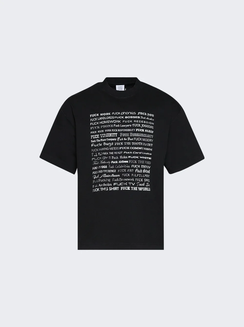 Details - Regular fit - Crewneck - Dropped shoulders - Short sleeves - Text printed at front - Straight hem - Care according to label - Material: 100% Cotton Vendor Color Code: Brand Style: ME76TR212BX Designer/Brand: VETEMENTS