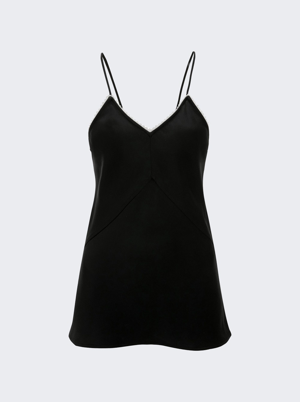 Details - Contrast lace detail neckline - Self rouleau straps - Front and back diagonal seam detailing with topstitch - Straight hem - Care according to label - Material: 71% Acetate, 29% Viscose Size Information: Vendor Color Code: Brand Style: 1325WTP006544A Designer/Brand: VICTORIA BECKHAM