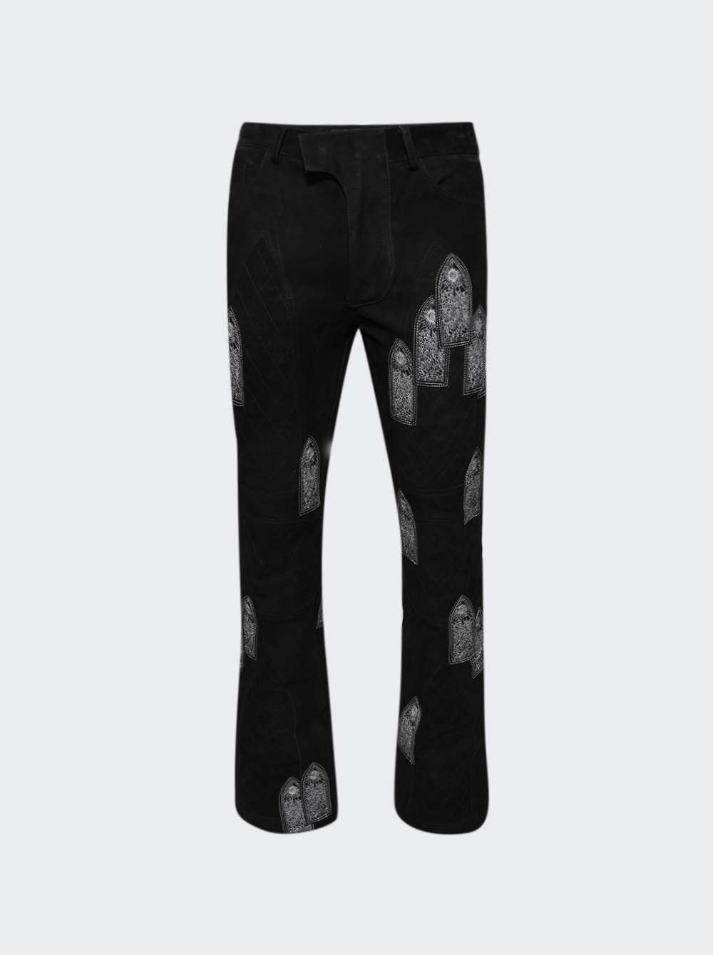 Details - Regular fit - Embroidered graphic patches - Belt loops - Zip and button fastening - Five pocket design - Fully lined - Care according to label - Material: Suede - Model is 6'1"/185cm and is wearing a size US33 Brand Style: 1120820002FW24 Designer/Brand: WHO DECIDES WAR